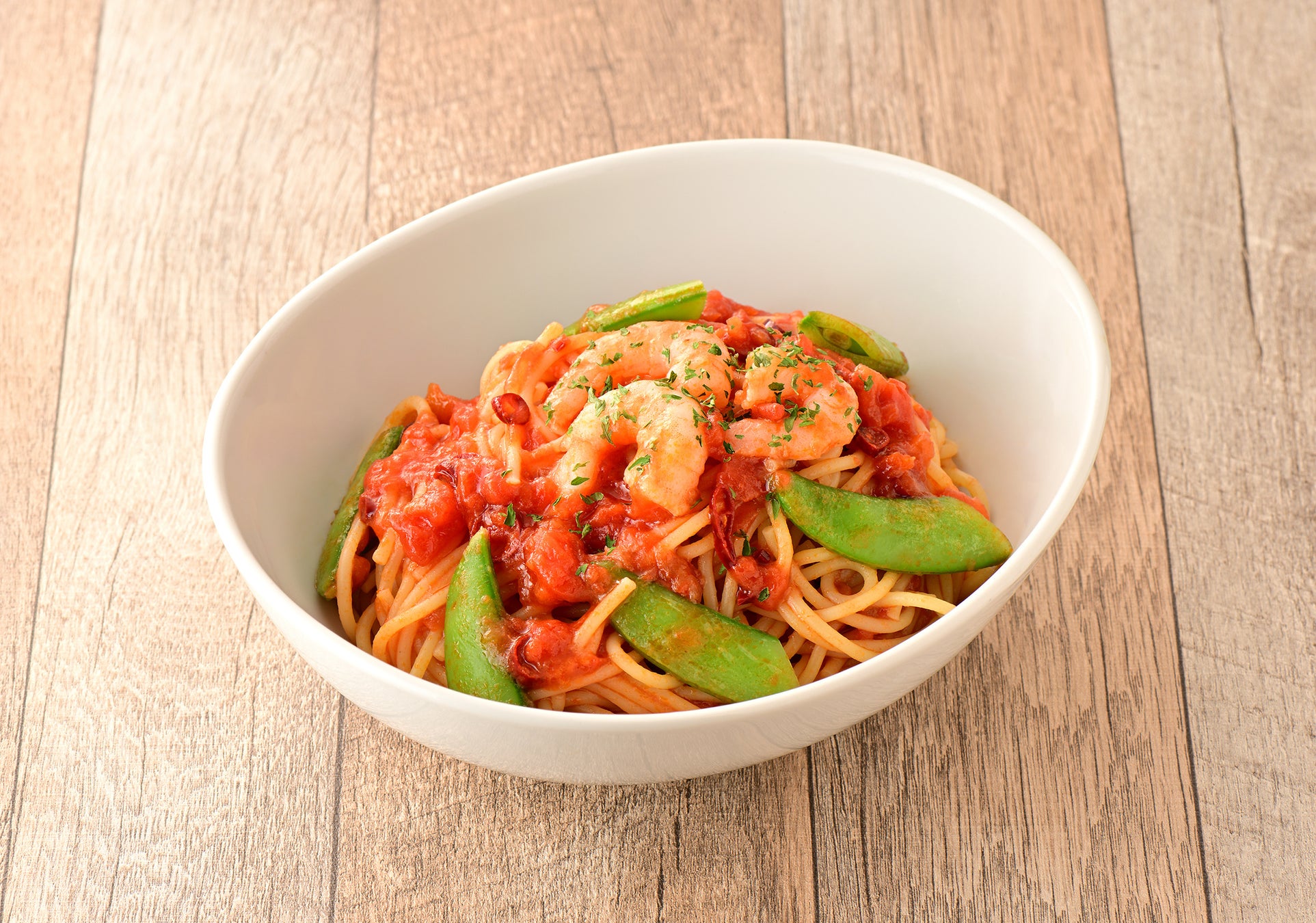 | ピリ辛なトマトソースパスタに、ぷりぷりの海老と春野菜のスナップえんどうをトッピングした、季節のパスタです。 |