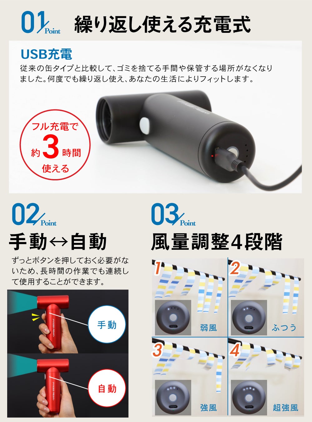 USB Type-Cで充電が出来るため、従来のスプレー缶使用の製品とは違いゴミが出る心配もありません。