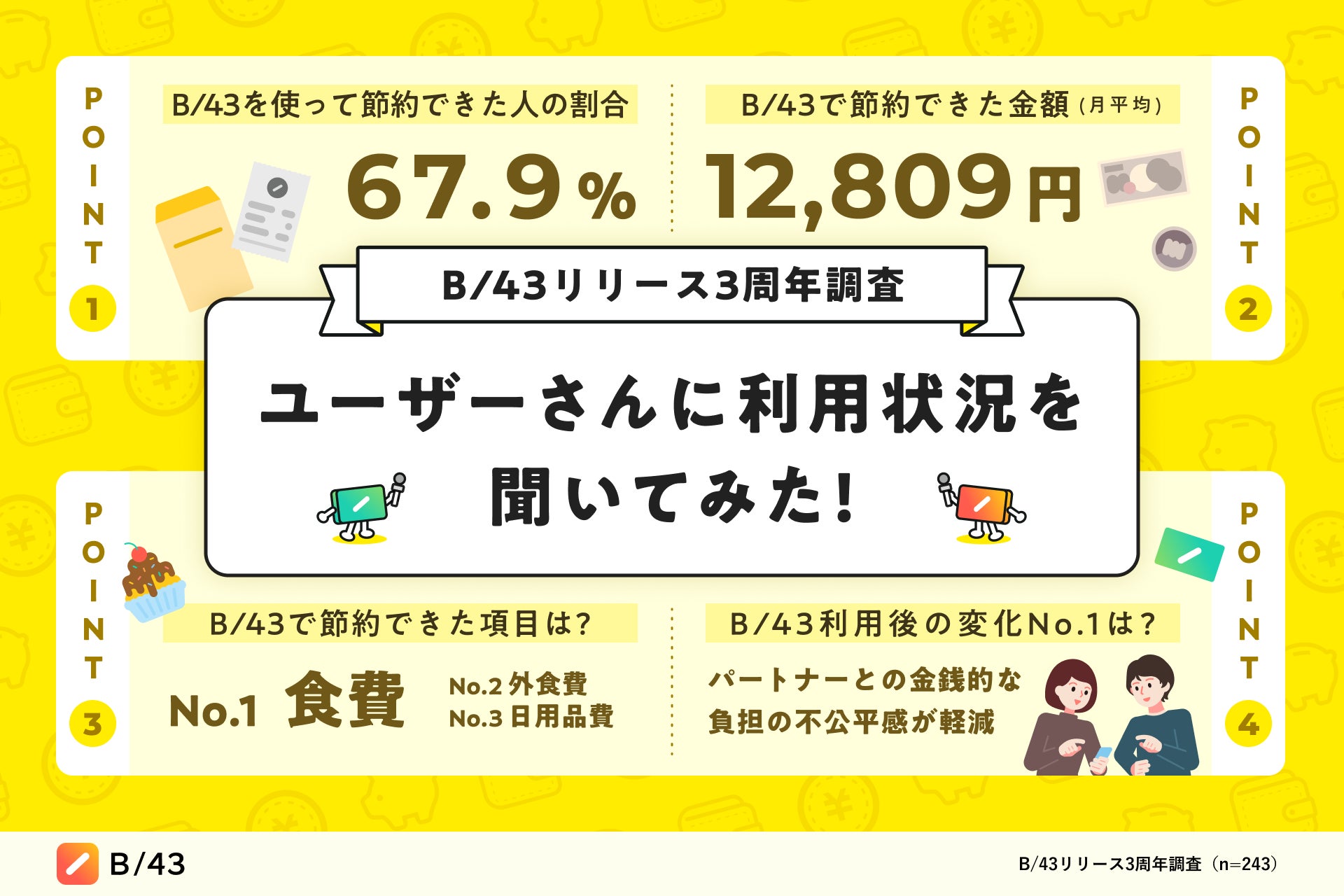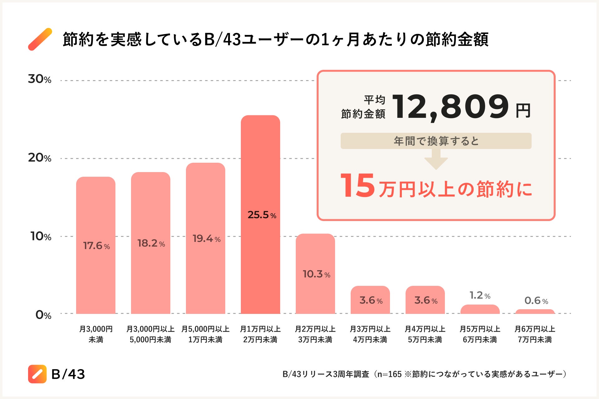 【B/43 リリース3周年】約7割のユーザーがB/43利用による節約効果を実感。月平均12,809円の節約効果、年15万円以上の節約につながる可能性