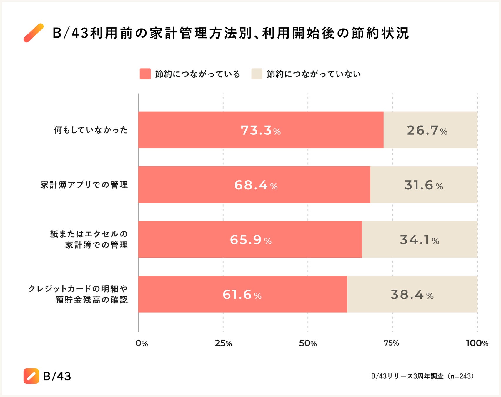 「節約につながっている」と実感しているユーザーを、B/43利用前の家計管理方法別に見ると、最も多いのは「何もしていなかった」ユーザーで73.3%となりました。また、次いで「家計簿アプリでの管理」をしていたユーザーで68.4%となり、これまで家計簿アプリを活用していた方でもB/43の利用によって節約効果を実感できていることがわかりました。