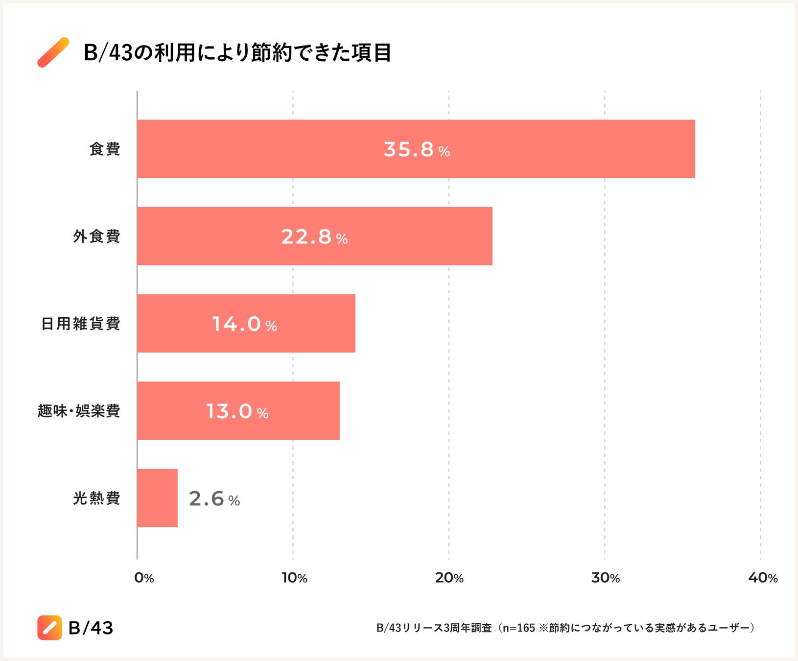 B/43の利用により節約できた項目を質問したところ、食費(35.8%)が最も多い回答となりました。次いで、2位が外食費(22.8%)、3位が日用雑貨費(14.0%)、4位が趣味・娯楽費(13.0%)、5位が光熱費(2.6%)という結果になりました。