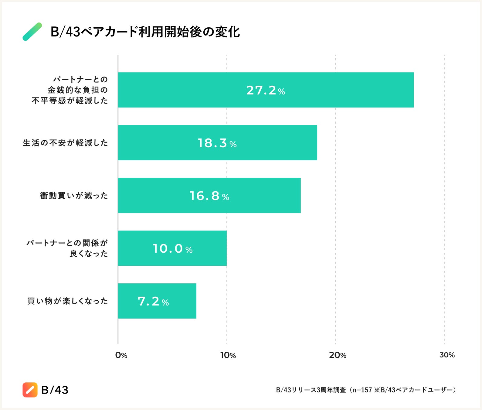 B/43ペアカード(共有口座)を利用しているユーザーに、利用開始後の変化について質問したところ、「パートナーとの金銭的な負担の不平等感が軽減した」(27.2%)が最も多い回答となりました。次いで、2位が「生活の不安が軽減した」(18.3%)、3位が「衝動買いが減った」(16.8%)、4位が「パートナーとの関係が良くなった」(10.0%)、5位が「買い物が楽しくなった」(7.2%)という結果になりました。