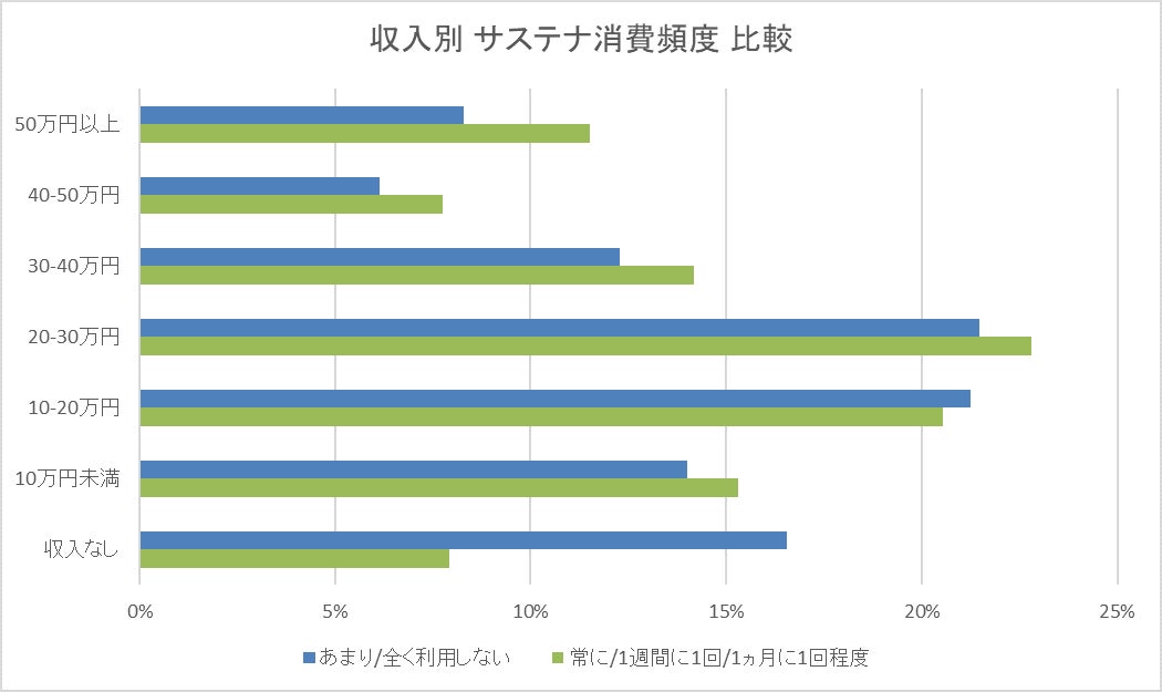 世帯収入とサステナブル消費の頻度には一定の相関があるといえます。高収入層ではサステナブル消費の頻度が高くなる一方、低収入層では頻度が低い傾向が見られます。ただし、月収10万未満の層での消費頻度が高いことから、収入以外の要因も関与している可能性も考えられます。