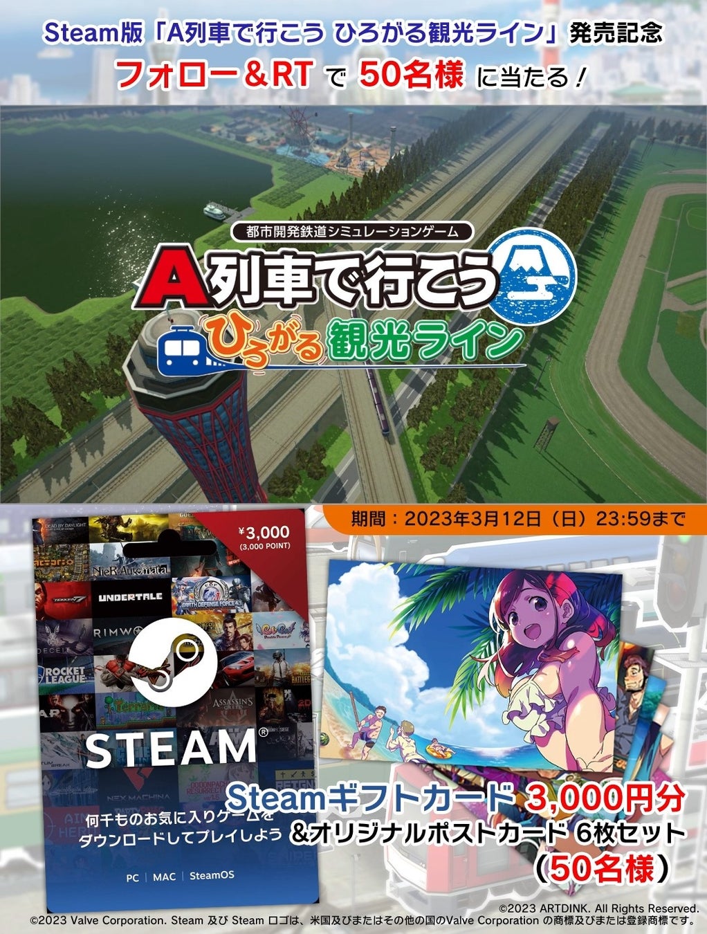 Steamギフトカード3,000円分&「ひろがる観光ライン」オリジナルポストカードセット
