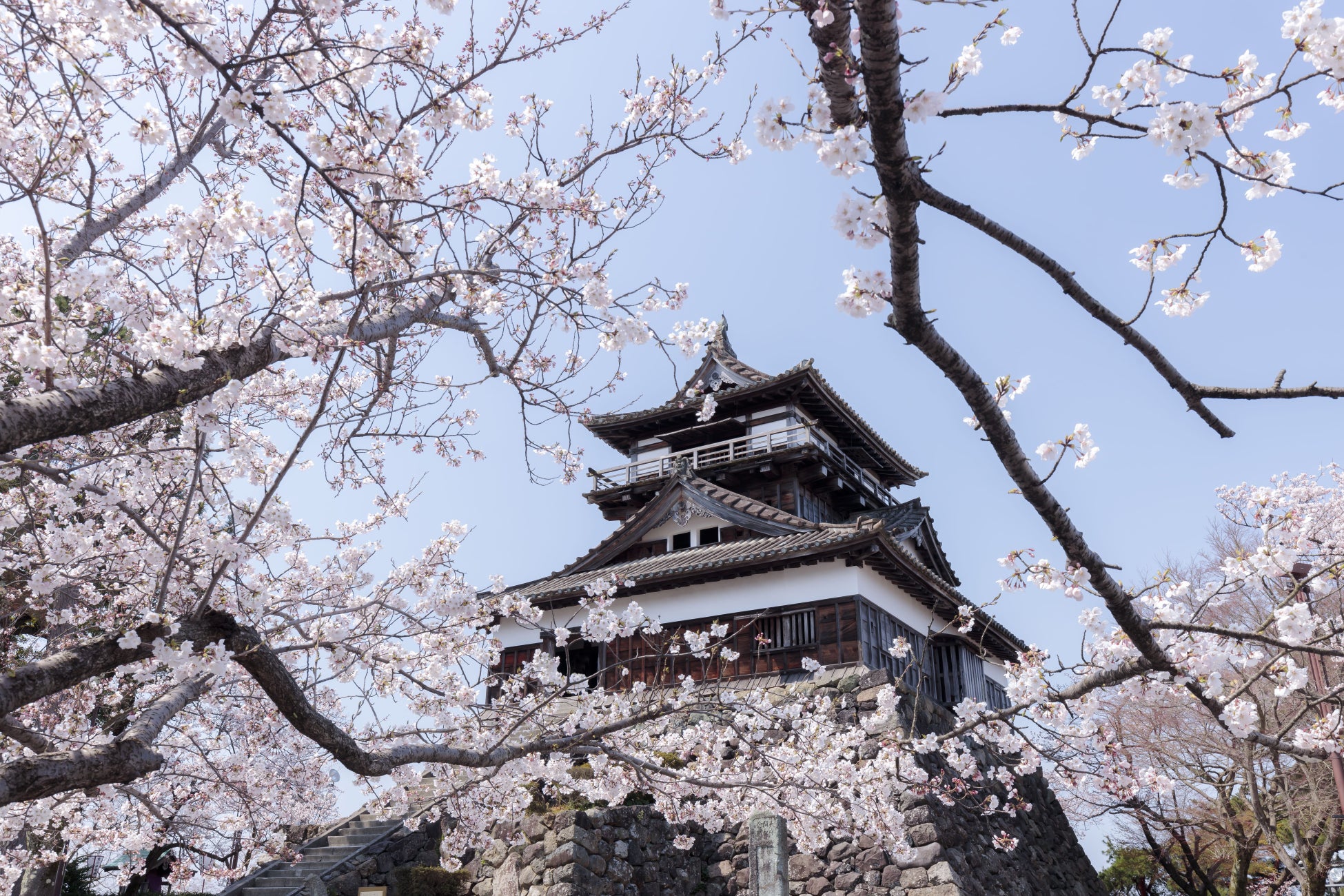 丸岡城は別名霞ヶ城とも呼ばれ、平野の独立丘陵を利用してつくられた平山城です。春の満開の桜の中に浮かぶ姿は幻想的で、ひときわ美しいものとなっています。戦国時代の天正4年(1576年)一向一揆の備えとして、織田信長の命を受けて柴田勝家の甥・勝豊が築きました。標高27mの独立丘陵を本丸として天守を築き、その周囲に二の丸と内堀、その外側に三の丸と外堀を巡らせていました。