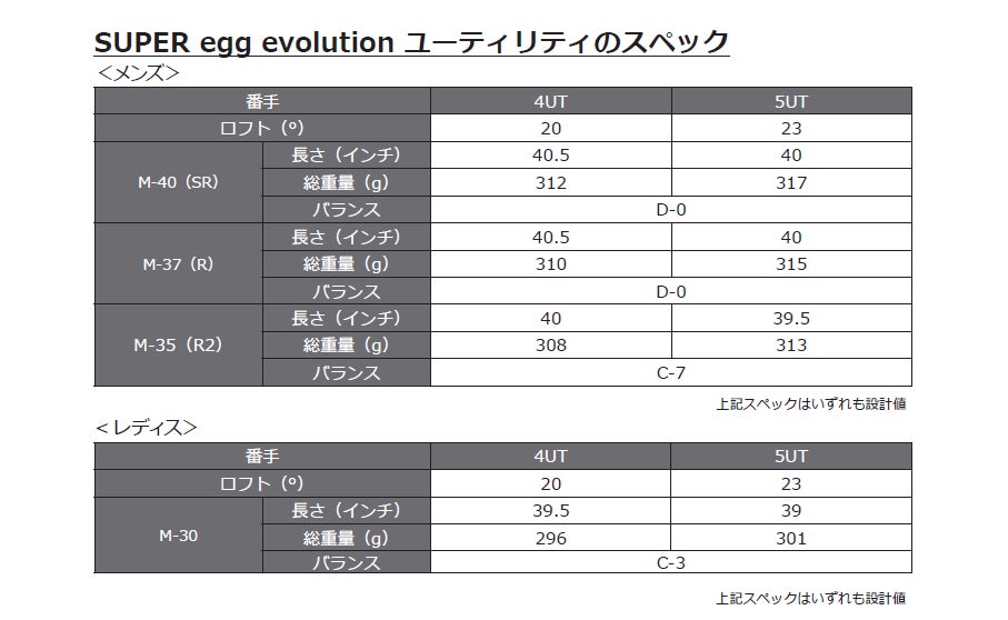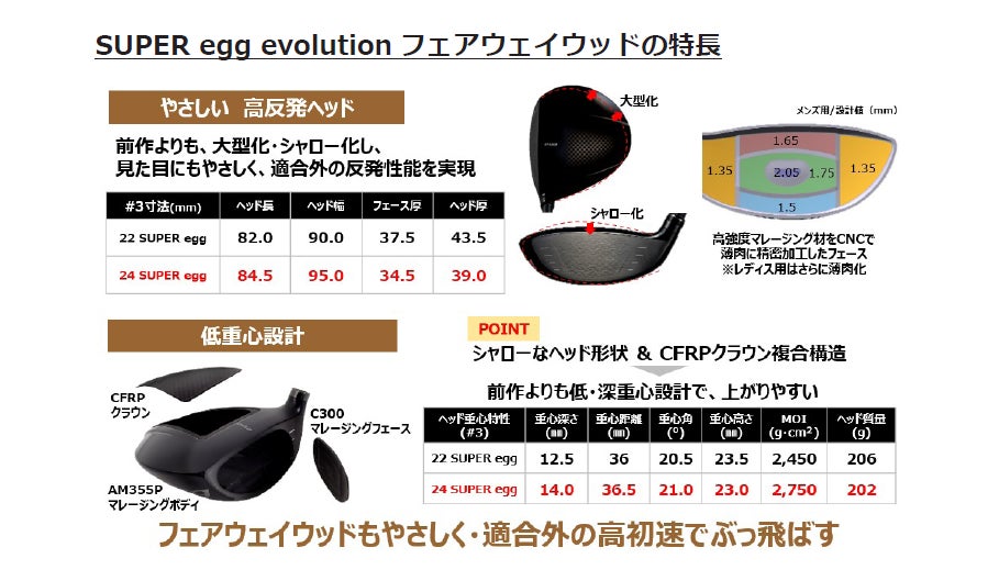 「SUPER egg evolution フェアウェイウッド」は、見た目でやさしさを感じられるようにヘッドは従来シリーズよりも大型化、シャロー化しながら、CNCで薄肉に精密加工を施した高強度マレージングフェースを採用することでSLEルールを超える高反発を実現しました。また、従来シリーズよりもシャローなヘッド形状とCFRP複合構造による低・深重心設計でよりボールが上がりやすくなっています。「SUPER egg evolution ユーティリティ」は、従来シリーズよりもヘッド厚を薄く、クラウンを落としたシャロー形状とすることで見た目のやさしさを持たせながら、フェアウェイウッド同様に、CNCで精密加工した高強度マレージングフェースを採用することでSLEルールを超える高反発を実現しました。さらに超低重心設計でボールが上がりやすく、ロングアイアンの距離がやさしく打てるクラブとなっています。