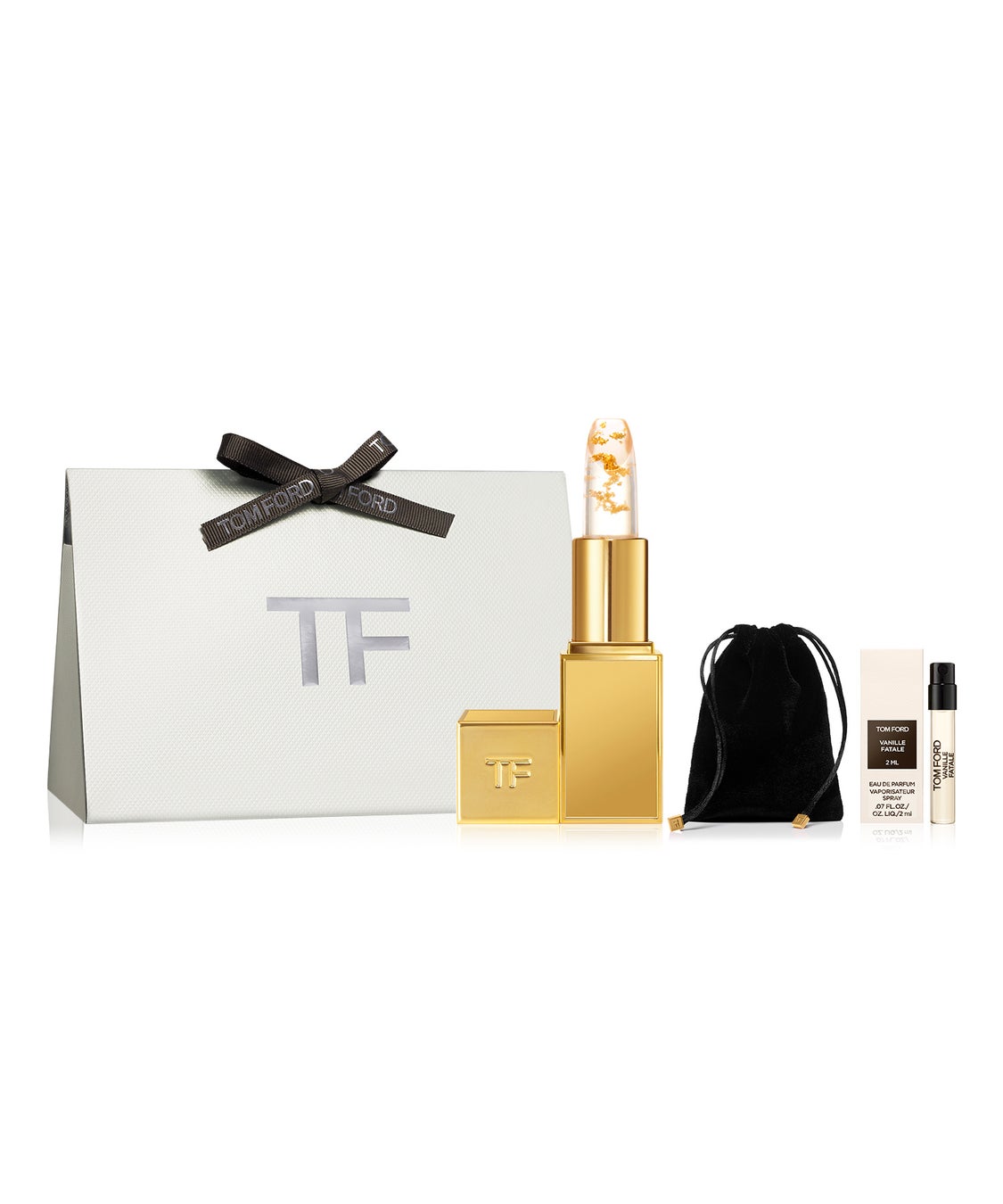 金の薄片が輝くリップバームと、人を惹きつけるバニラ ファタールのミニフレグランスのセット。