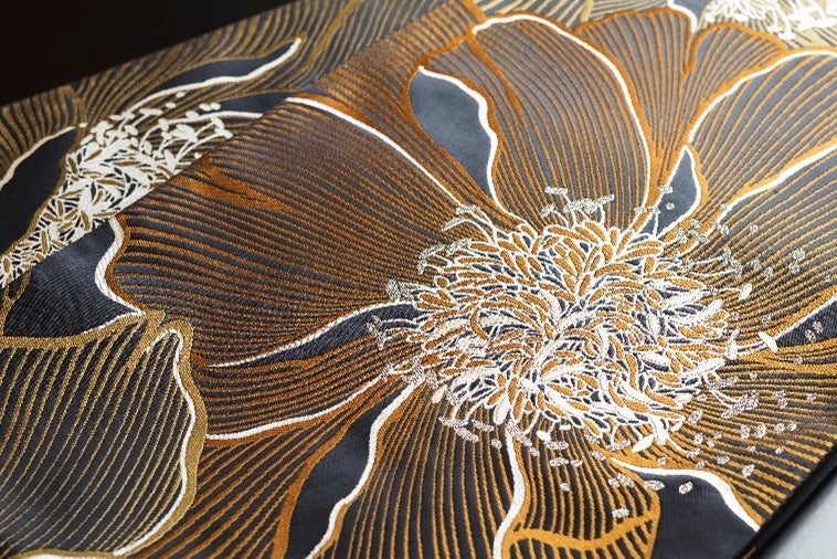 きものは、能登の海藻で地染めし、草木染めを施した能州紬に、銀糸を織り込んだ繊細な逸品。大胆な構図が目をひく袋帯は、光沢ある黒地の緞子に麹塵(きくじん)の糸を使って織り上げました。光があたると線描の花が浮き上がりいっそう華やかになります。きものと帯の調和が美しい、印象的なコーディネートです。