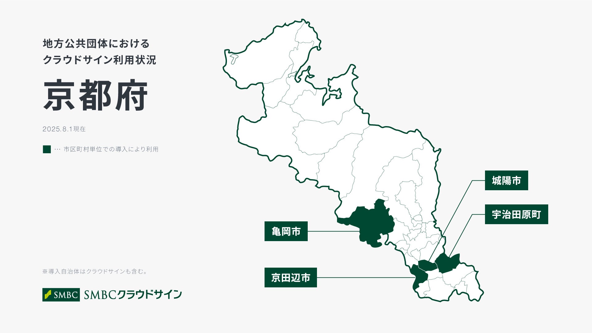 SMBCクラウドサイン株式会社(代表取締役社長:三嶋 英城)が提供するクラウド型電子契約サービス「SMBCクラウドサイン」と、弁護士ドットコム株式会社(東京都港区、代表取締役社長 兼 CEO・弁護士:元榮 太一郎)が提供する契約マネジメントプラットフォーム「クラウドサイン」は、京都府内において、亀岡市、城陽市、京田辺市、宇治田原町の4自治体で導入・支援を行ったことをお知らせします。