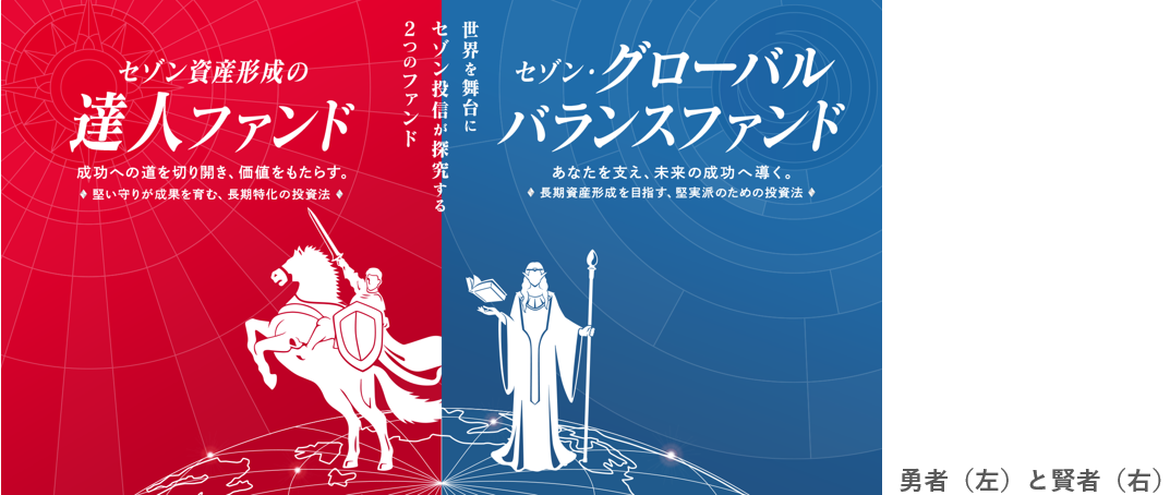 セゾン資産形成の達人ファンドは、インデックスよりもリスクを抑える守りを軸に高いリターンを目指す運用方針を”勇者”に、セゾン・グローバルバランスファンドの丁寧なリバランスでリスクを抑えていく堅実な投資スタイルを”賢者”に投影しております。