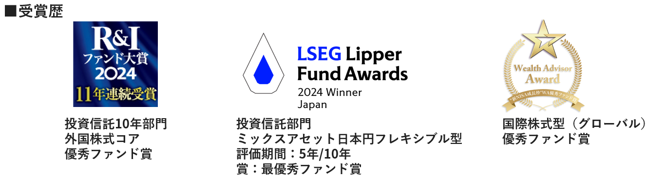 LSEG リッパー・ファンド・アワードは毎年、多くのファンドのリスク調整後リターンを比較し、評価期間中のパフォーマンスが一貫して優れているファンドと運用会社を表彰いたします。選定に際しては、「Lipper Leader Rating (リッパー・リーダー・レーティング)システム」の中の「コンシスタント・リターン(収益一貫性)」を用い、評価期間3年、5年、10年でリスク調整後のパフォーマンスを測定いたします。評価対象となる分類ごとに、コンシスタント・リターンが最も高いファンドにLSEG リッパー・ファンド・アワードが贈られます。詳しい情報は、lipperfundawards.comをご覧ください。LSEG Lipperは、本資料に含まれるデータの正確性・信頼性を確保するよう合理的な努力をしていますが、それらの正確性については保証しません。