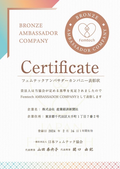 『フェムテックアンバサダー・カンパニー』1社目として「産経新聞社」を表彰