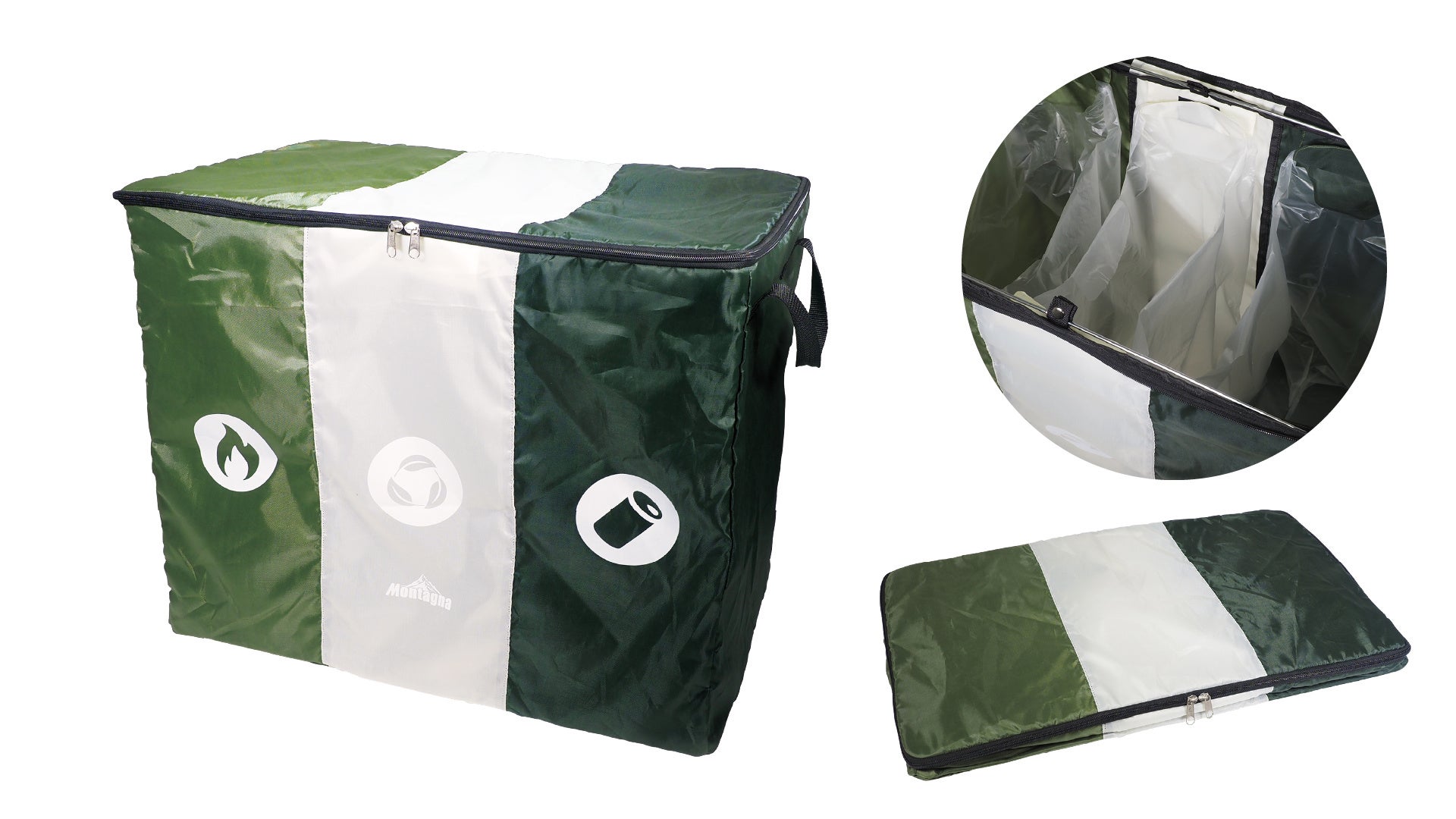 特徴:3色の色分でごみの分別に大活躍のアイテム。内側上部の6つの面ファスナーで3つの袋を固定できます。簡単な組み立てで自立可能。上面にはフタ付き。