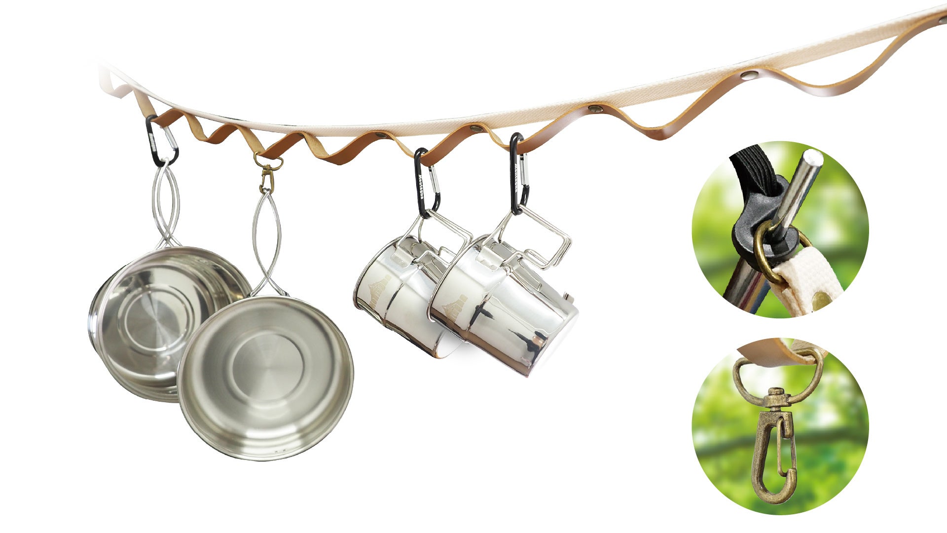 特徴:最大全長約2.75mのハンギングベルト。ナチュラルカラーがキャンプサイトにも良く馴染みます。