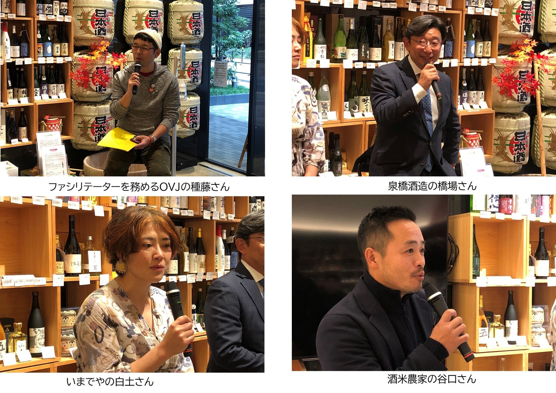 パネリストは、農家を代表して、長野県伊那市で無農薬、無施肥の米づくりを行っている谷口修さん(Wakka agri)。酒蔵からは、原材料の酒米を自社栽培している泉橋酒造の橋場友一社長、流通からお酒の専門店・いまでやバイヤーの白土暁子さん、ファシリテーターとしてオーガニックヴィレッジジャパン(以下、OVJ)事務局長/理事の種藤 潤さんにて行いました。