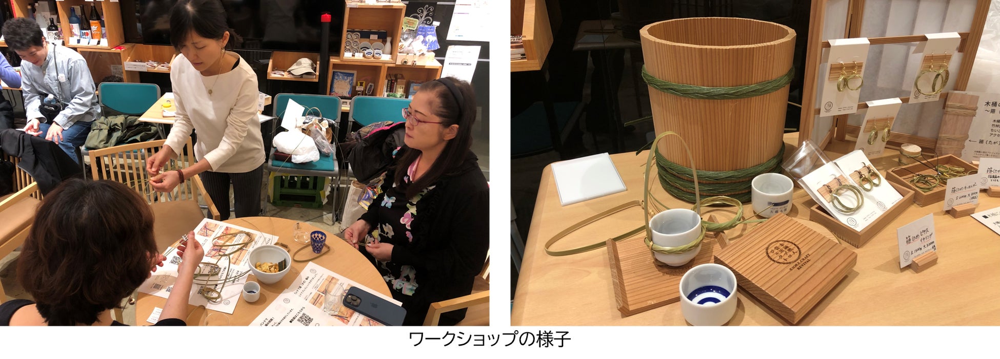 というワークショップも開催。箍は、桶や樽など側を堅く締めるために用られる竹などを裂いて編み、輪にしたもの。木桶に使う際に出た竹の端材を有効活用し、実用的なお猪口ストラップを作ってみるというワークショップでは、参加者自身で箍編みを楽しんでいました。