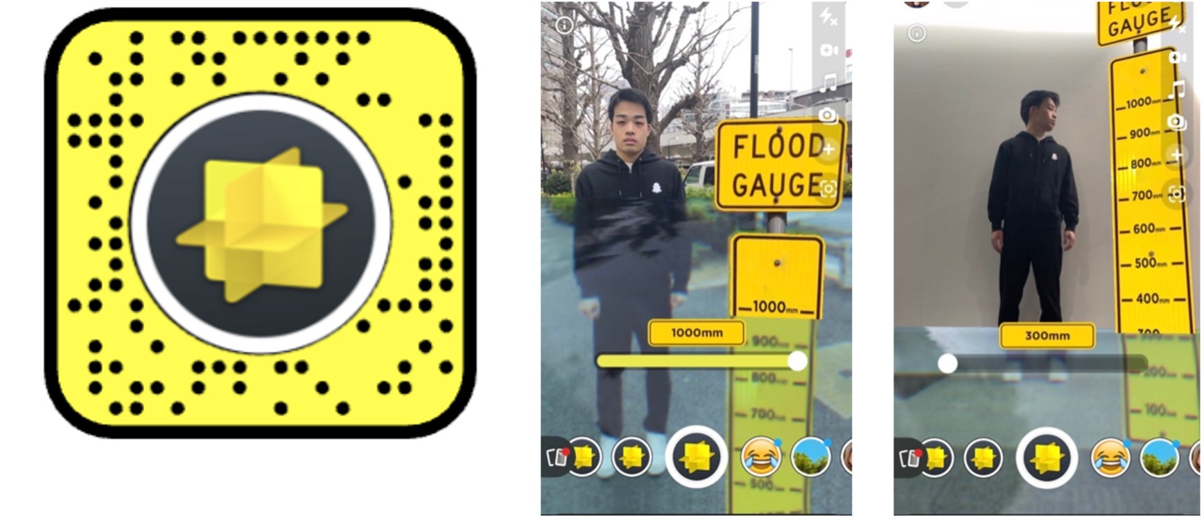 また、日本は壊滅的な津波の存在でも知られています。津波の水位が急上昇した場合、多くの人が逃げ場を失います。これを受け、人々が冷静に行動し十分な情報を得た上で判断できるよう、現在地周辺の水位を確認できる「洪水シミュレーション」レンズを開発しました。洪水時、水位30cmでは水圧でドアが開かなくなり、津波発生時に迅速な避難が困難となります。Snapchatの「洪水シミュレーション」レンズでは、各水位をARで擬似的に確認することにより、洪水時の視覚的な疑似体験ができます。
