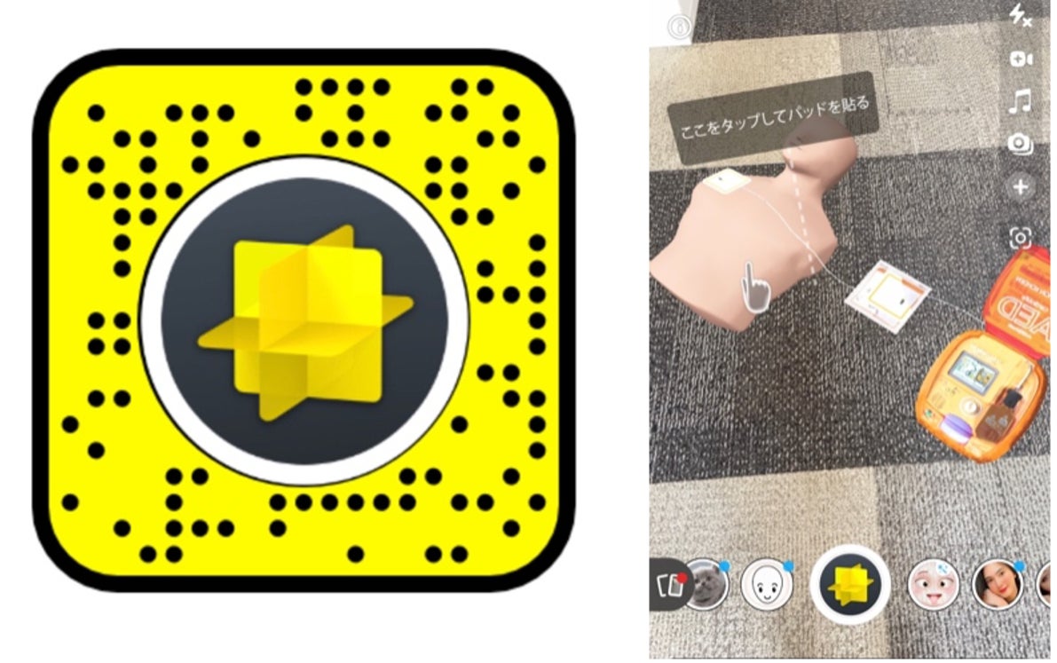 スナップコード又はSnapchatのカルーセルでレンズを開くと、等身大のデジタル傷病者とAEDが現れ、AEDの使用方法手順を示します。