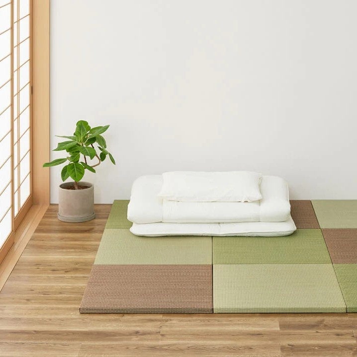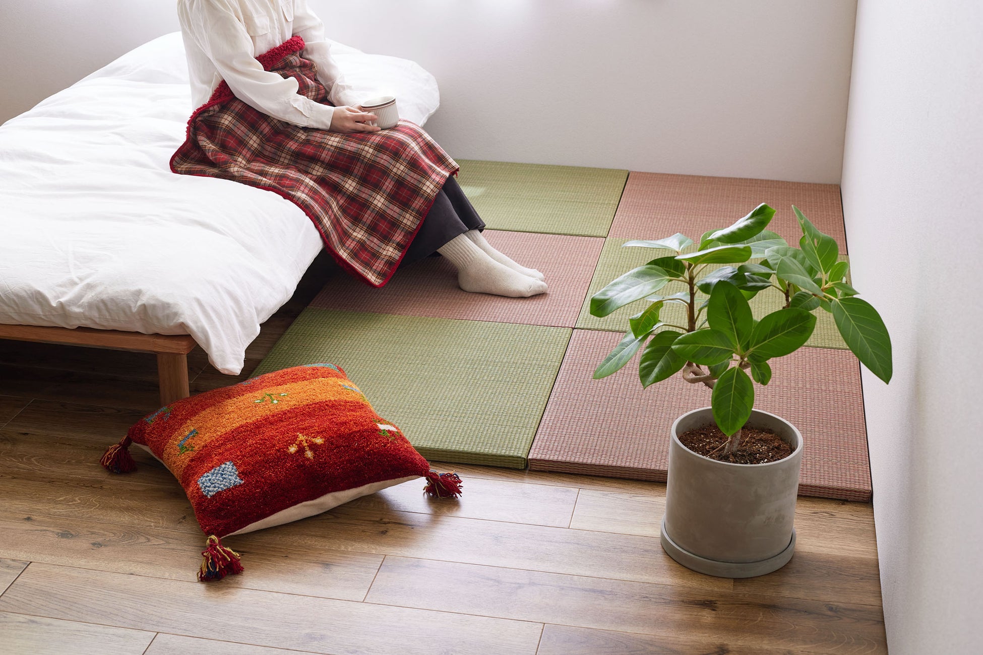 和室のある住宅が減りつつある昨今、フローリングに直接布団を敷くと湿気がこもりそうで不安ですよね…。い草置き畳なら、い草の持つ天然の湿度調整機能が床と布団の間のジメジメを軽減し、カビやダニの心配を減らしてくれます。寝室や子どものお昼寝スペースはもちろん、来客時の簡易寝室にもおすすめです。
