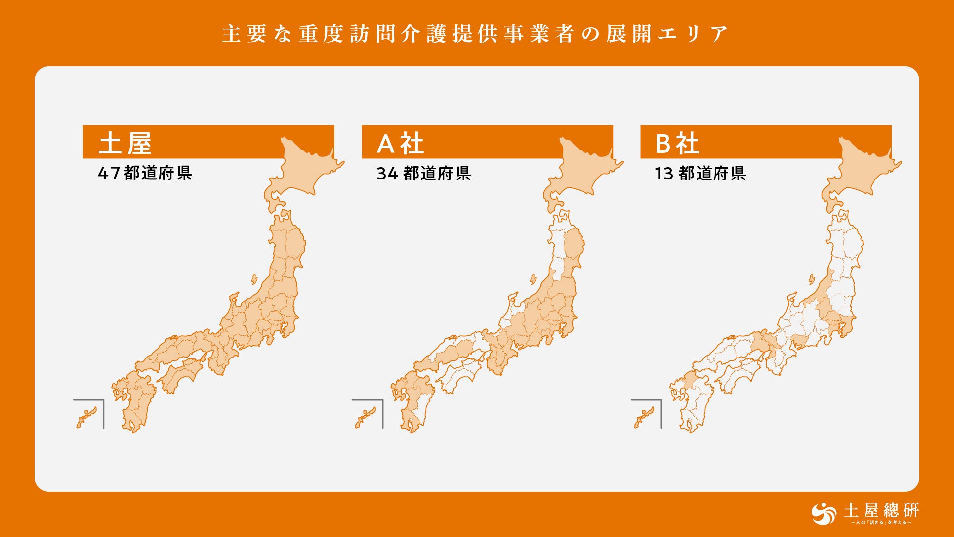本リリースでは、現在、日本で唯一全国で重度訪問介護事業を提供する企業として※、重度訪問介護のヘルパー不足の現状を知っていただきたいと考え、土屋グループに寄せられたご依頼のデータを公開します。本データは、全国47都道府県の重度訪問介護利用者に関する調査結果です。一企業内のデータではありますが、重度訪問介護に関するデータが不足している現状において、地域間の比較やサービス改善の検討に役立つ貴重な情報になりうると考えています。