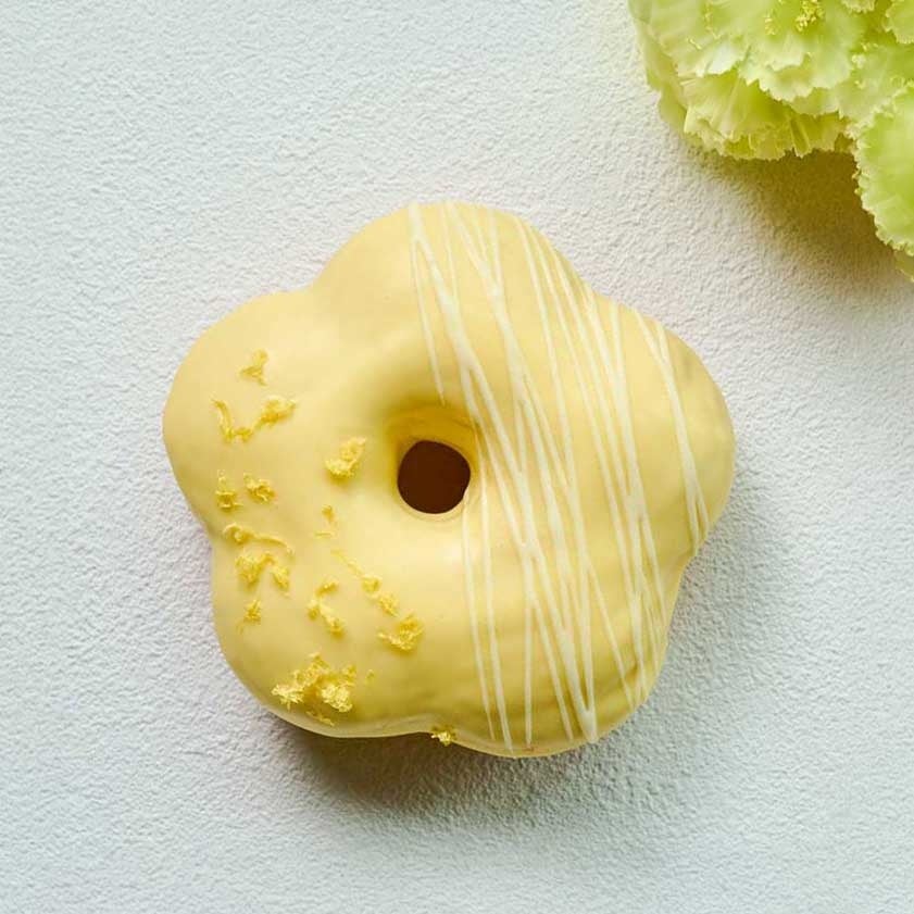 花形のブリオッシュ生地のドーナツにレモンチョコレートをコーティングし、レモンピールとホワイトチョコレートでデコレーションしました。やわらかなカラーが可愛く、レモンの風味がほのかに感じられる仕上がりです。