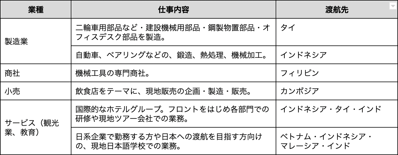- 受入企業国・業種と研修内容(2022年夏期実績)