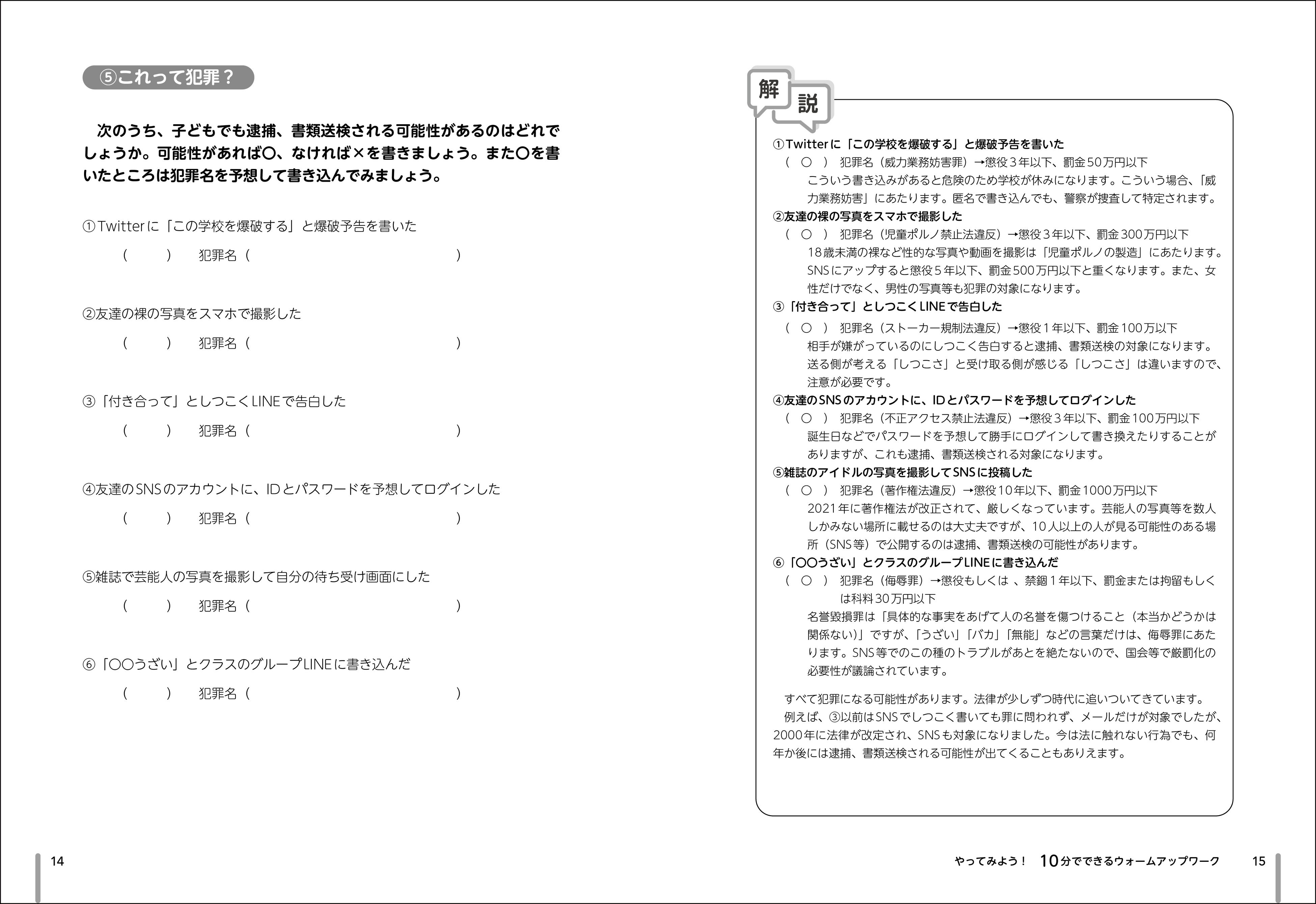 序盤に、子どもたちのネットに対する考えを引き出せるような10分でできるワークを用意しました。学校で取り組むときは、コピーして道徳や総合的な学習の時間にも使用できます。