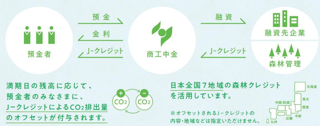 J-クレジット預金とは、J-クレジット(森林由来クレジット)によるカーボン・オフセット*が付与される預金です。森林由来クレジットは、間伐等の森林の適切な管理を行うことによるCO2排出量をクレジットとして国が認証したものです。
