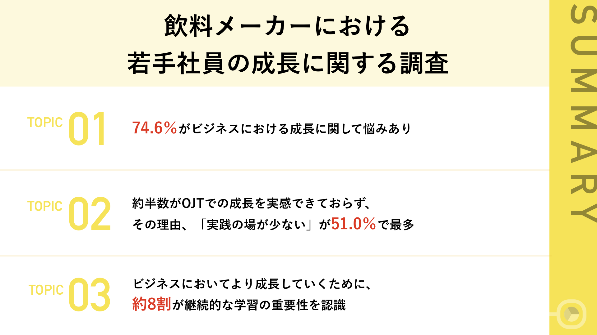 オンライン学習プラットフォーム「UMU(ユーム)」を展開しているユームテクノロジージャパン株式会社(本社:東京都港区、代表取締役:松田しゅう平、https://www.umujapan.co.jp、以下、ユームテクノロジージャパン)は、大手飲料メーカー(従業員数1,000名以上)に勤務する、入社3年目以内の会社員102名を対象に、飲料メーカーにおける若手社員の成長に関する調査を実施いたしましたので、お知らせいたします。