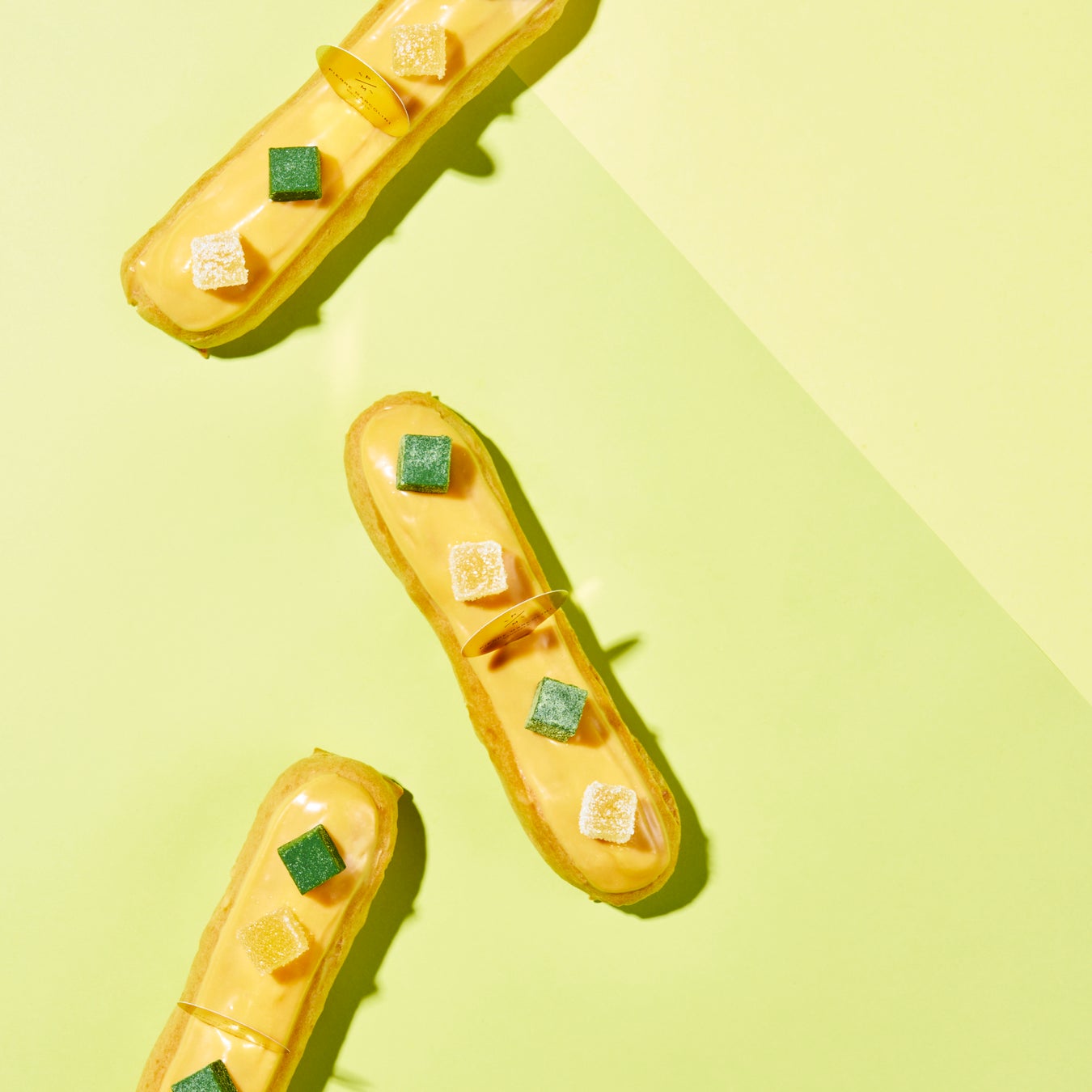 細長く焼いたシュー皮に、マンゴークリームをたっぷり詰め込みました。トッピングの抹茶の生チョコとユズのパートドフリュイと一緒に食べると一口ごとに異なる味わいが楽しめます。