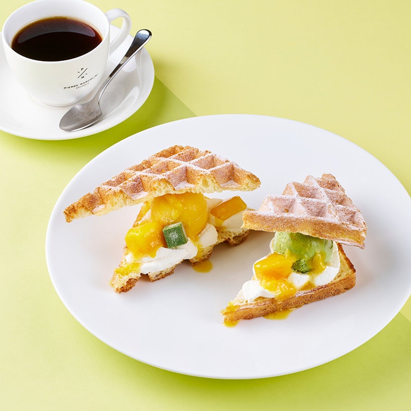こだわりのワッフルの上に、香り豊かな愛知県西尾抹茶とホワイトチョコレートのアイスとマンゴーユズソルベ載せた逸品。フレッシュな北海道根釧産生クリームにはマンゴーソースをたっぷりかけました。