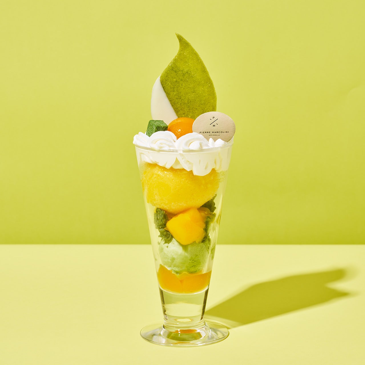マンゴーのトロピカルな甘みと奥深い愛知県西尾抹茶の香りが絶妙なバランスのパフェ。マンゴーにはユズの酸味を合わせて爽やかに、抹茶にはホワイトチョコレートを合わせてコクを引き出しました。抹茶のチュイルや生チョコ、フィヤンティーヌにマンゴー果肉、ゼリーなど様々な食感も楽しめる、表情豊かな逸品です。