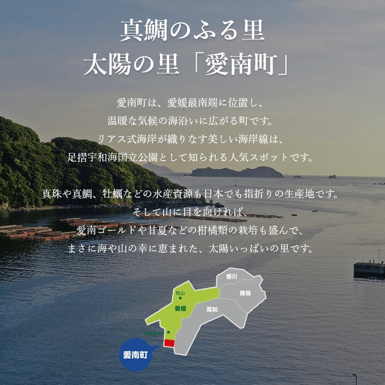 愛南町は、質・量とも日本で有数の真鯛の産地。流れ込む黒潮や宇和海の地形が身の締まった美味しい真鯛を育てます。