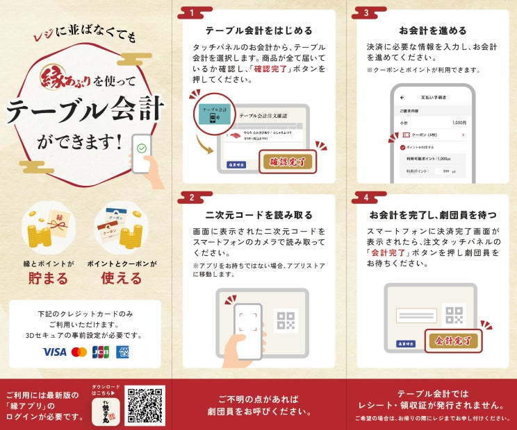 レジに並ばなくてもOK! 縁アプリの新機能「テーブル会計」で、お会計がスムーズに。また「お持ち帰りオンライン予約」での事前決済時、縁アプリのクーポン・ポイント利用が可能になりました。