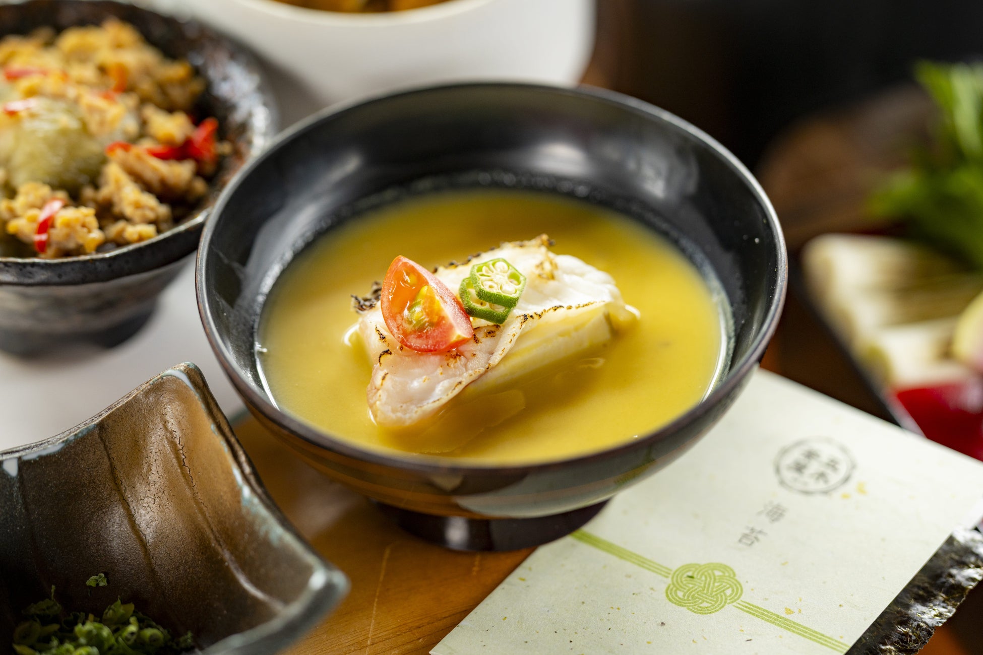 甘みのあるとうもろこしを丁寧にすり流しにし、京豆腐と鯛、彩り豊かな夏野菜を添えました。