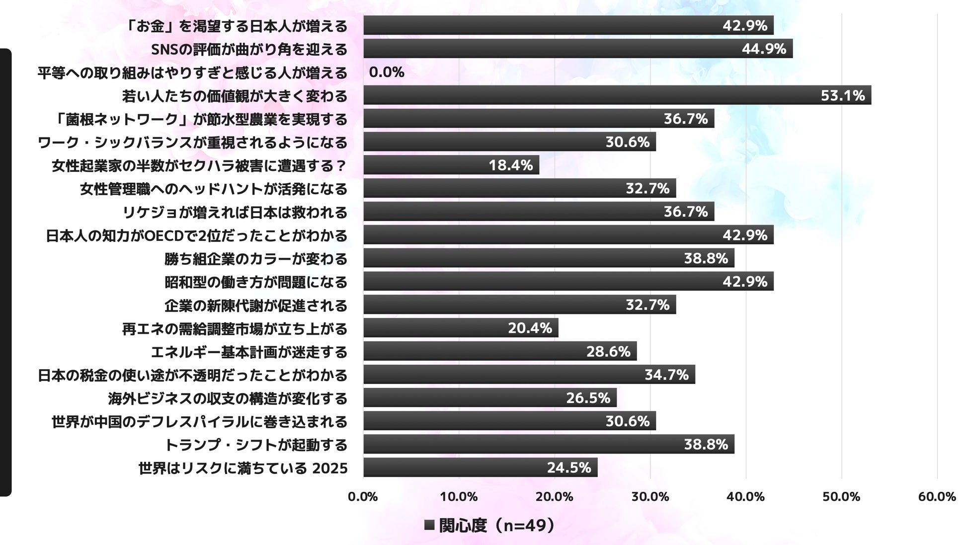 前号では2024年の変化を振り返りながら、2025年の「20のよげん」を発表する新年特別版を開催しました。参加者へのアンケートでは、下記トピックへの関心が高い結果となりました。