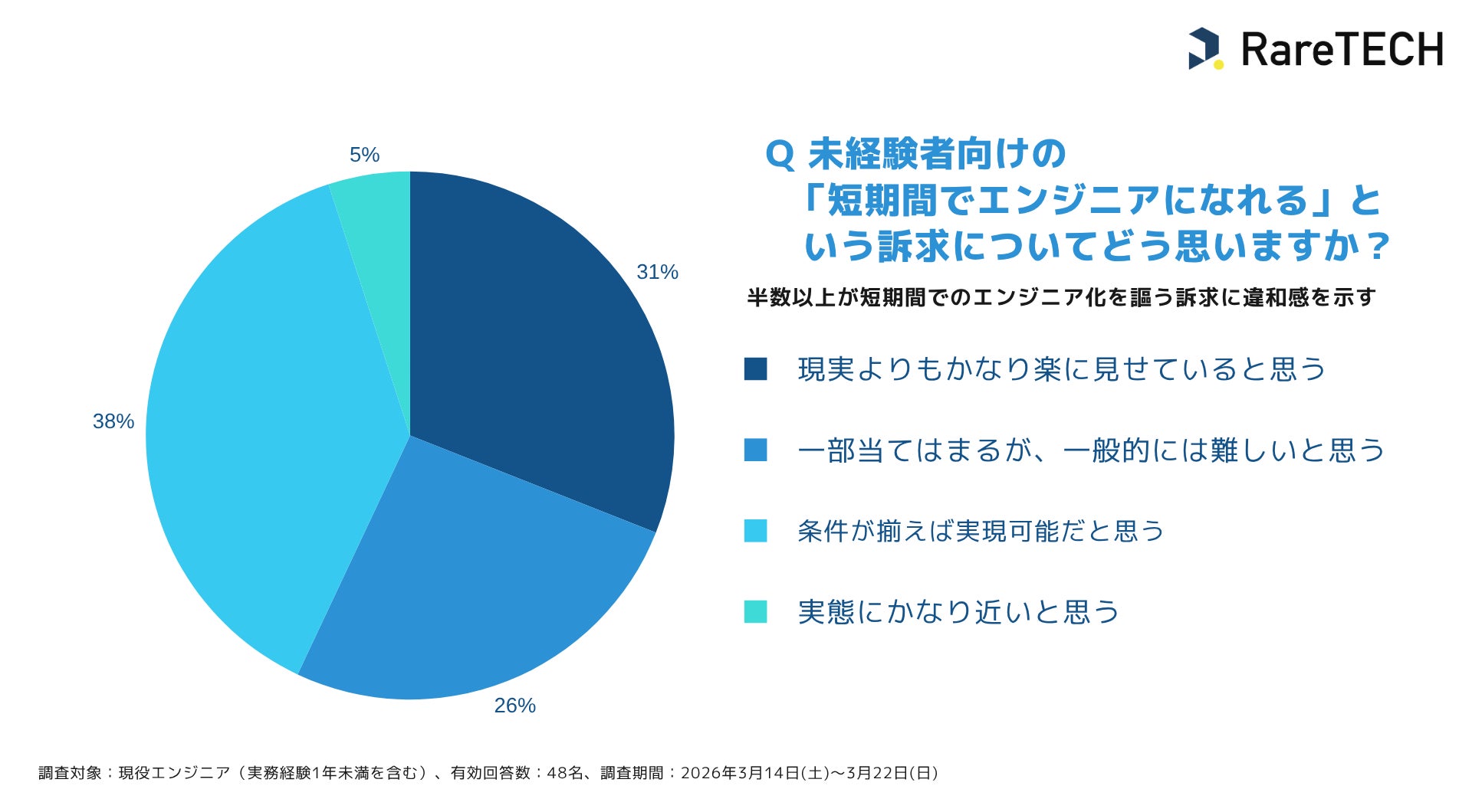 半数以上が短期間でのエンジニア化を謳う訴求に違和感を示す一方、実態に近いと回答したのはわずか5%にとどまりました。