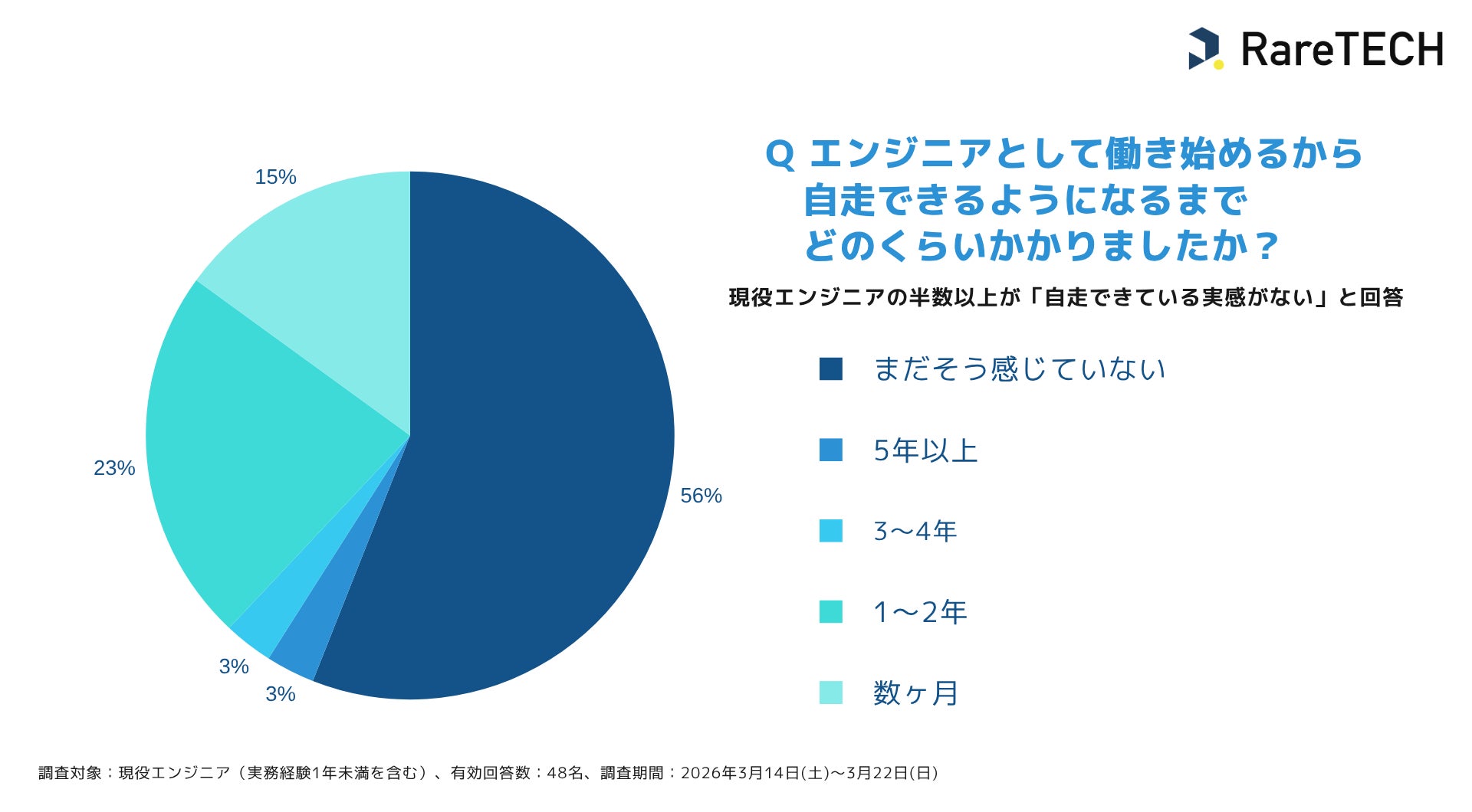 実際に、RareTECHが実施したアンケート調査では、現役エンジニアの56%が「自走できている実感がない」と回答しており、エンジニアとして自走できるレベルに到達するためには、長期間にわたる継続的な学習が不可欠であり、短期間の学習のみでは十分なスキル習得に至らないと考える人が多いことがわかりました。