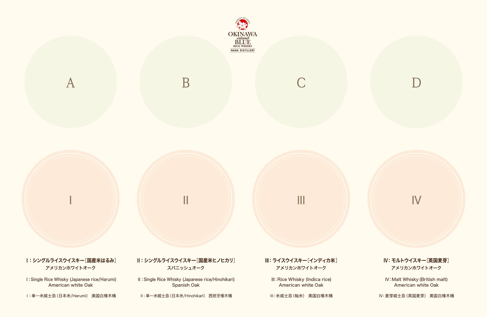 久米仙酒造が製造するウイスキーの原材料にお米を使用し、沖縄という亜熱帯気候で熟成した珍しいウイスキー。その高品質な原酒を4種類ご用意しました。ブレンドするウイスキーの種類や量の組み合わせは無限大。他では味わえない特別なウイスキーをお楽しみいただけます。