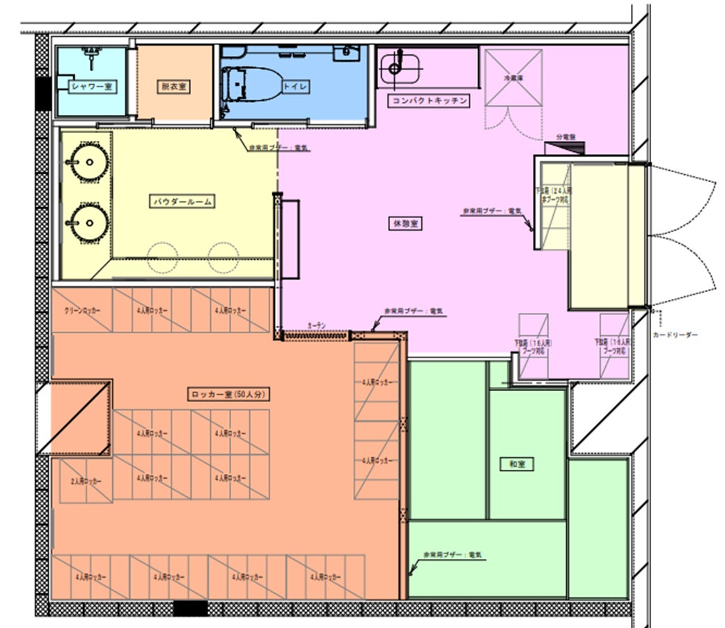 設備 | 休憩スペース、キッチン、トイレ、シャワールーム、パウダールーム、スマートフォン充電スペース、鍵付きロッカー、冷蔵庫、電子レンジ、人感センサー照明 【セキュリティ】 カードキー、オートロック、緊急ボタン |