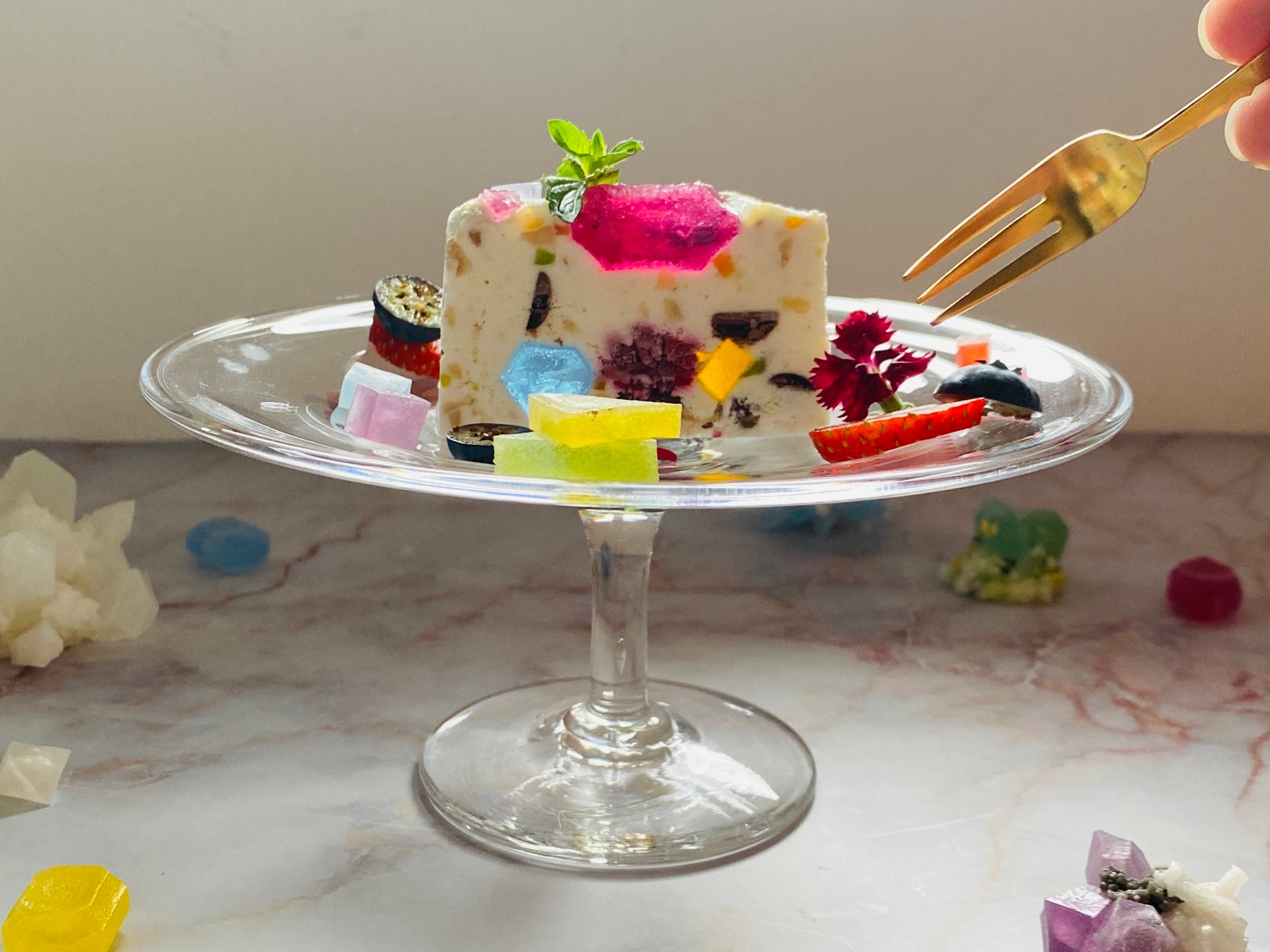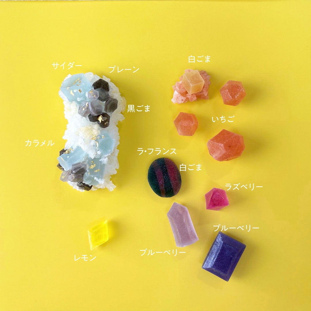 2月の誕生石である、 紫色のグラデーションが神秘的な美しい『アメシスト』の原石や、研磨すると猫の目のような光の筋が浮かぶことがその名の由来といわれる『クリソベリルキャッツアイ』を手切りの寒天菓子【琥珀糖】で表現しました。
