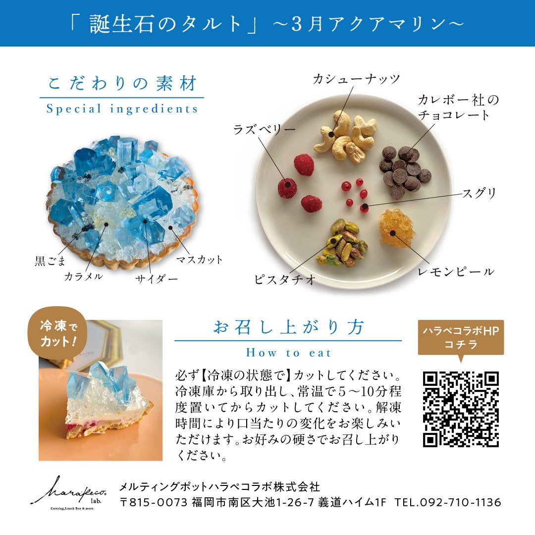【宝石のカッサータ】【2月のこうぶつヲカシ-誕生石Amethyst-】【3月のこうぶつヲカシ -誕生石Aquamarine-】は、ハラペコラボ福岡店にて販売中。