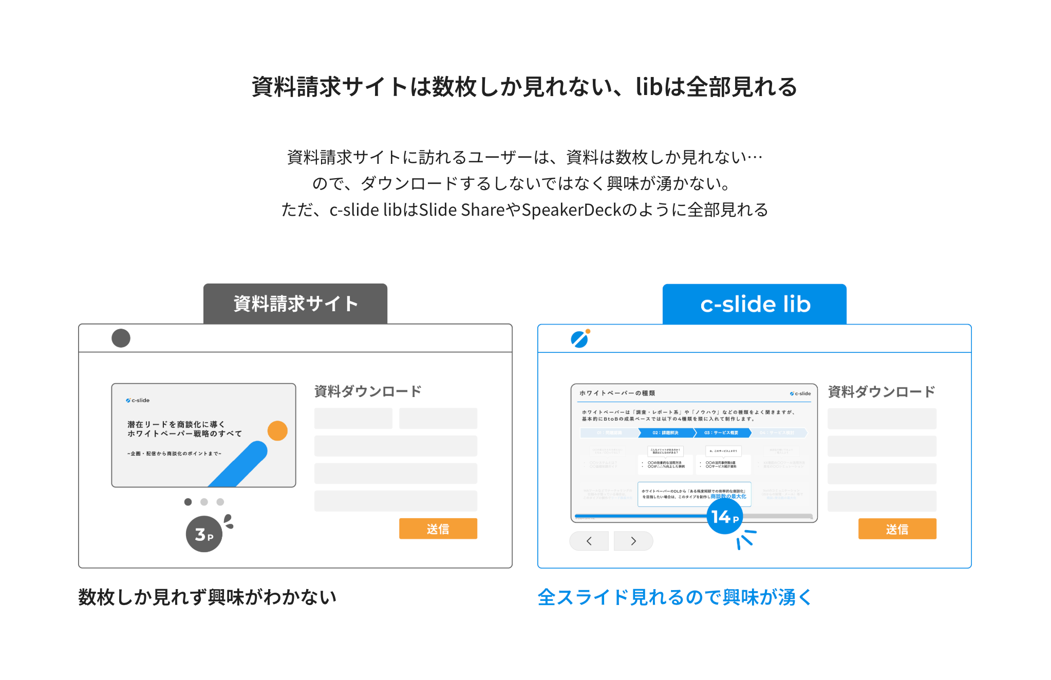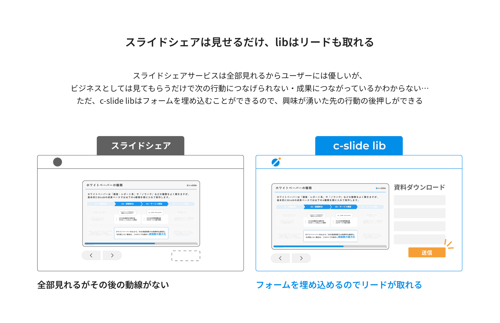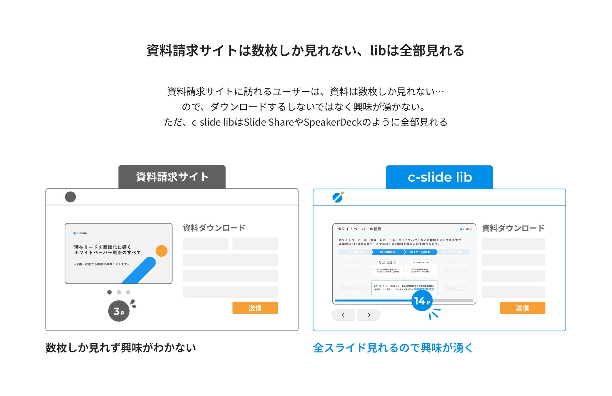 c-slide libは、上記状況を踏まえた「スライド共有サイト」と「資料請求サイト」の「いいとこ取り」を実現したスライド共有サービスとなっています。