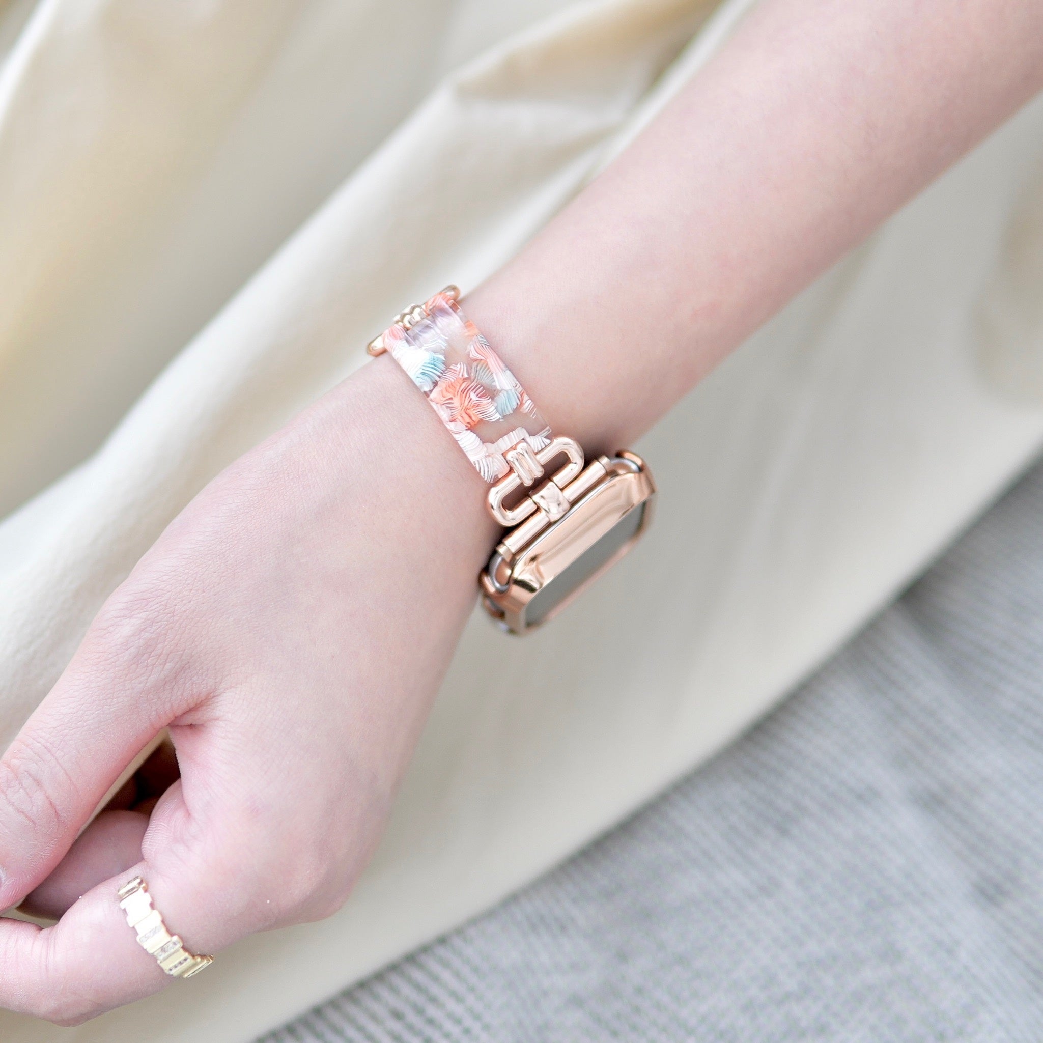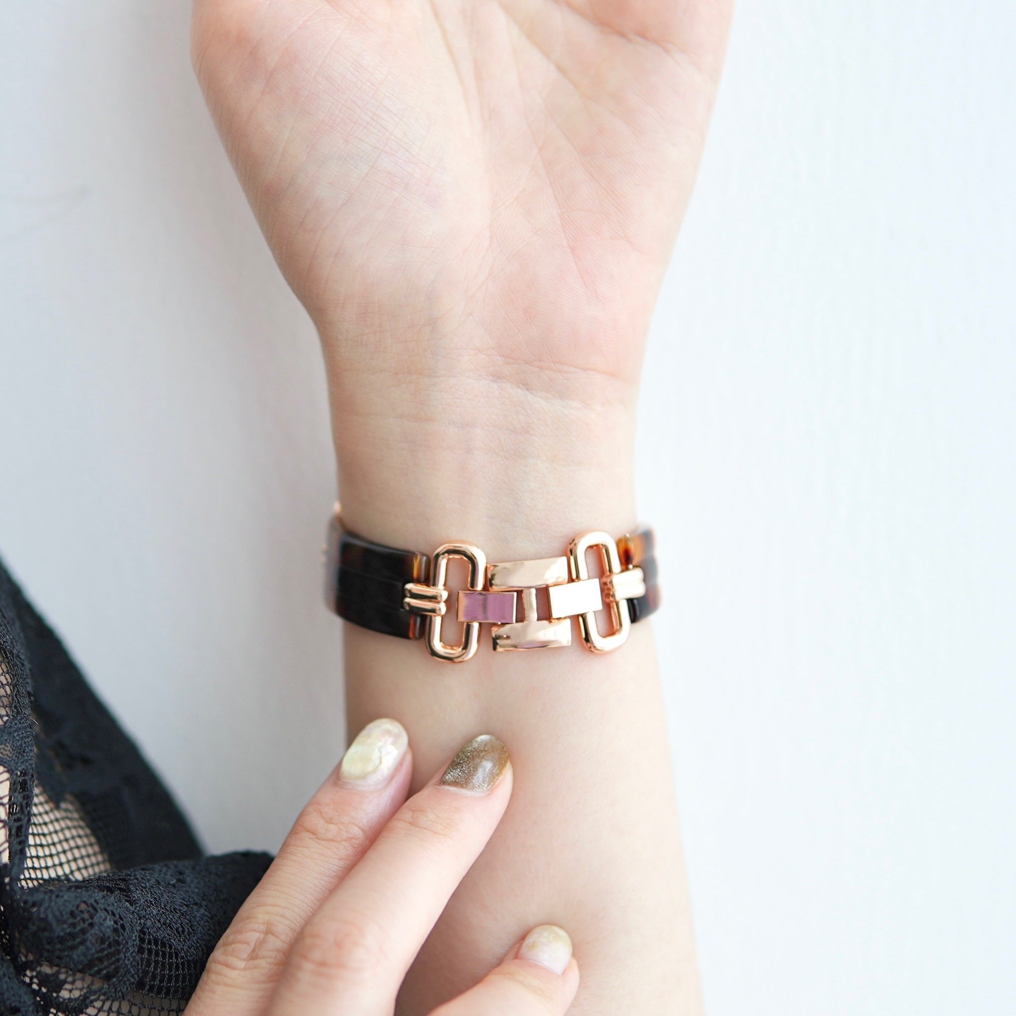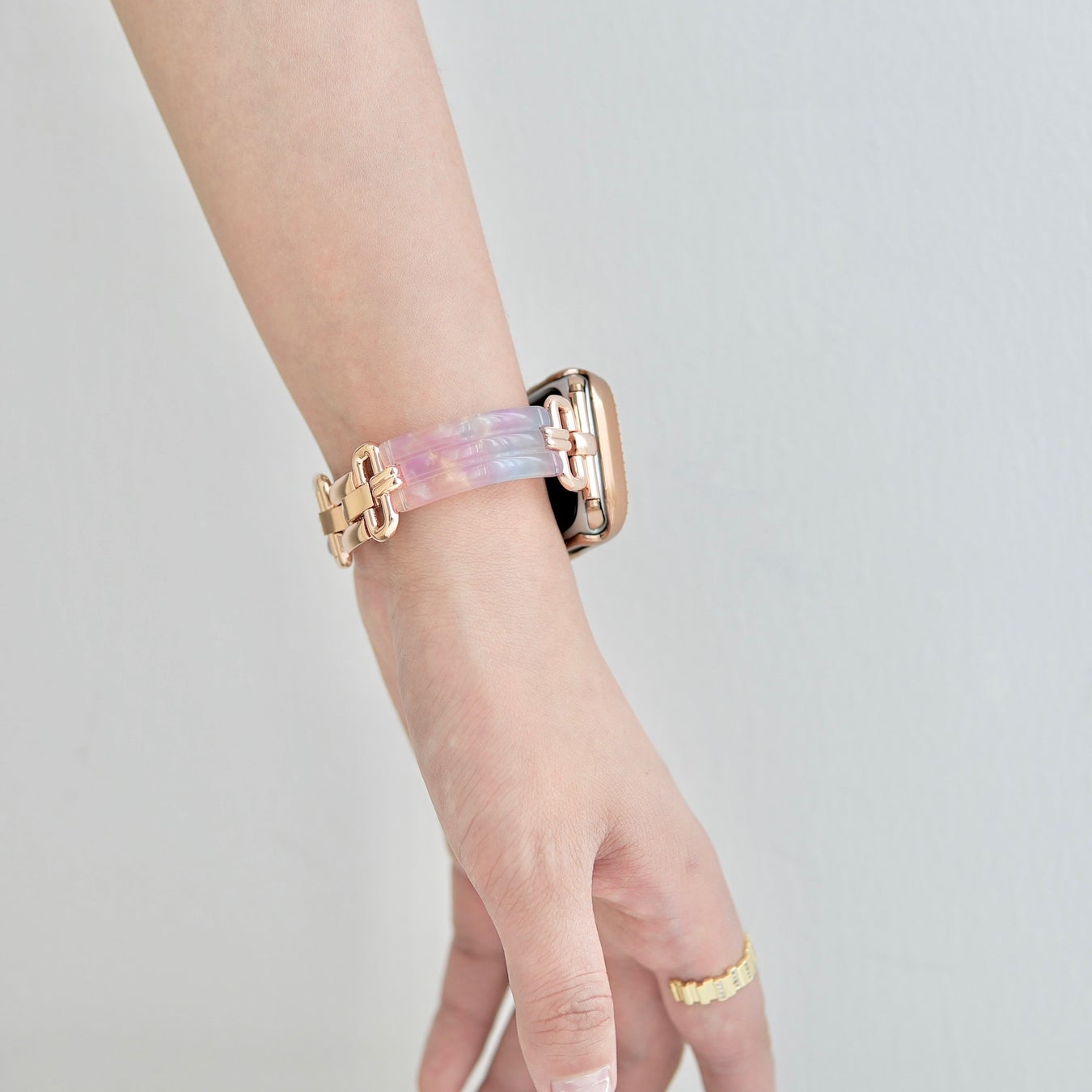 ニュアンスカラーが美しい、プラスチックとメタルの異素材ミックスバンドです。プラスチックの軽やかな透明感を、ゴールドの輝きが大人っぽく引き締めます。これからの季節にもぴったりのデザインです。