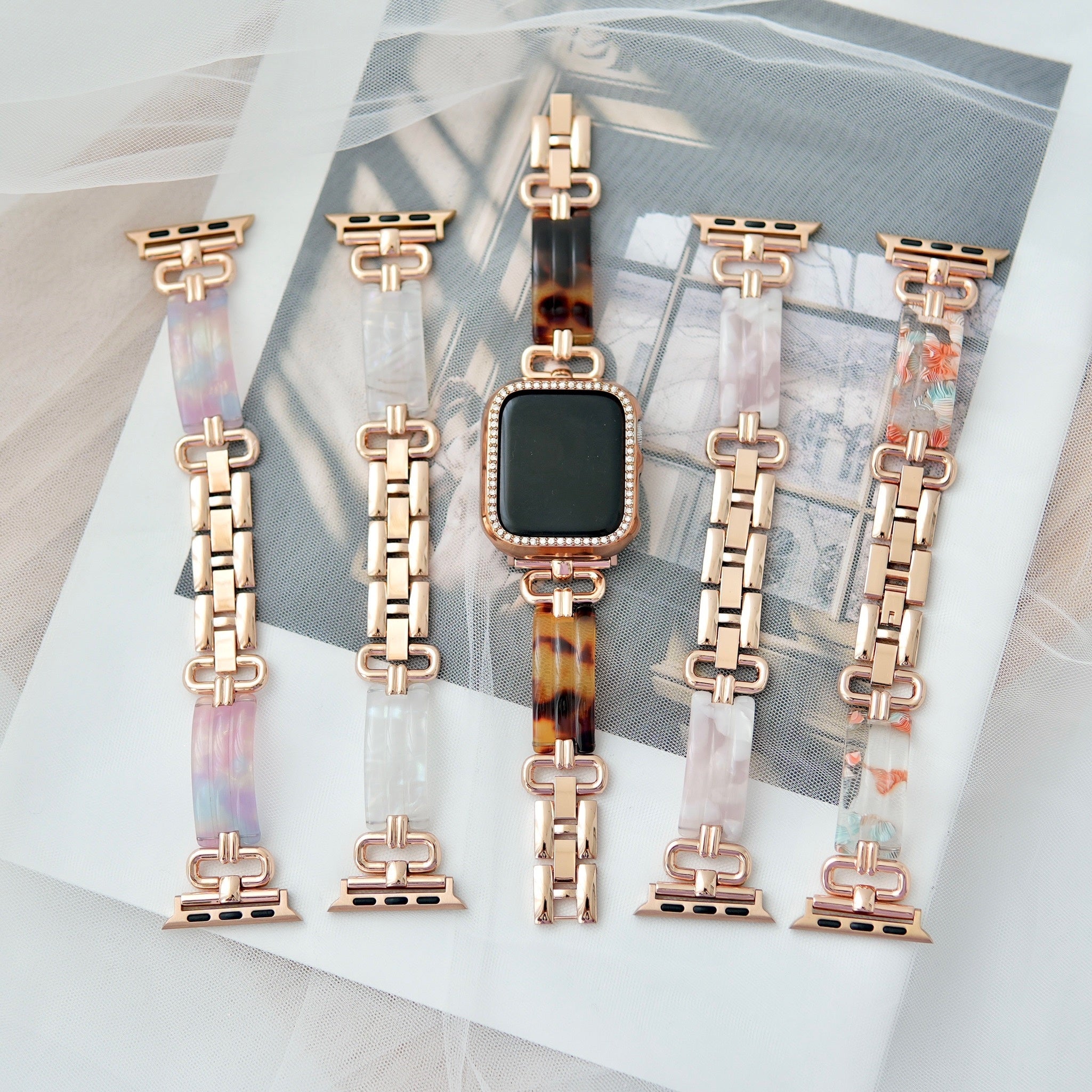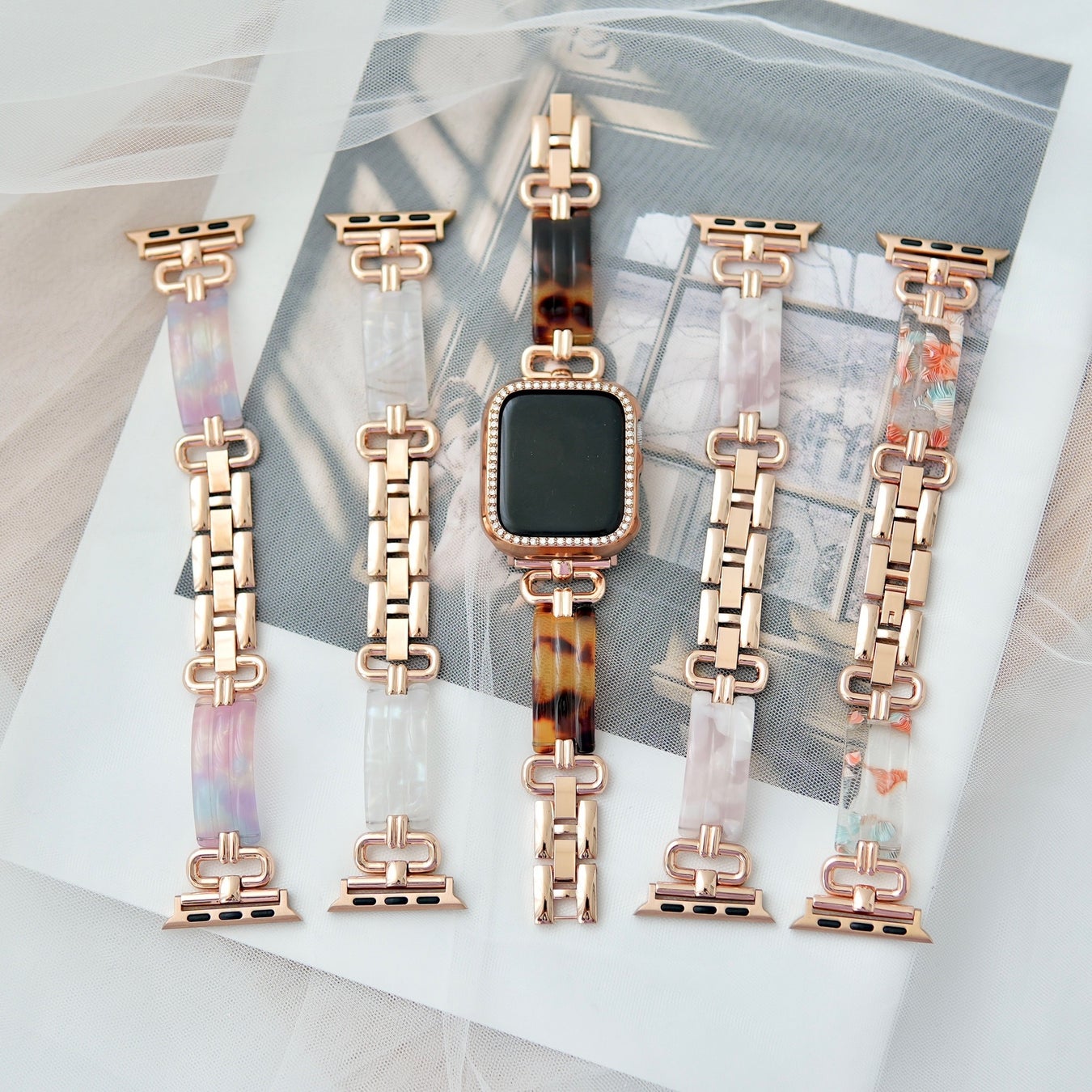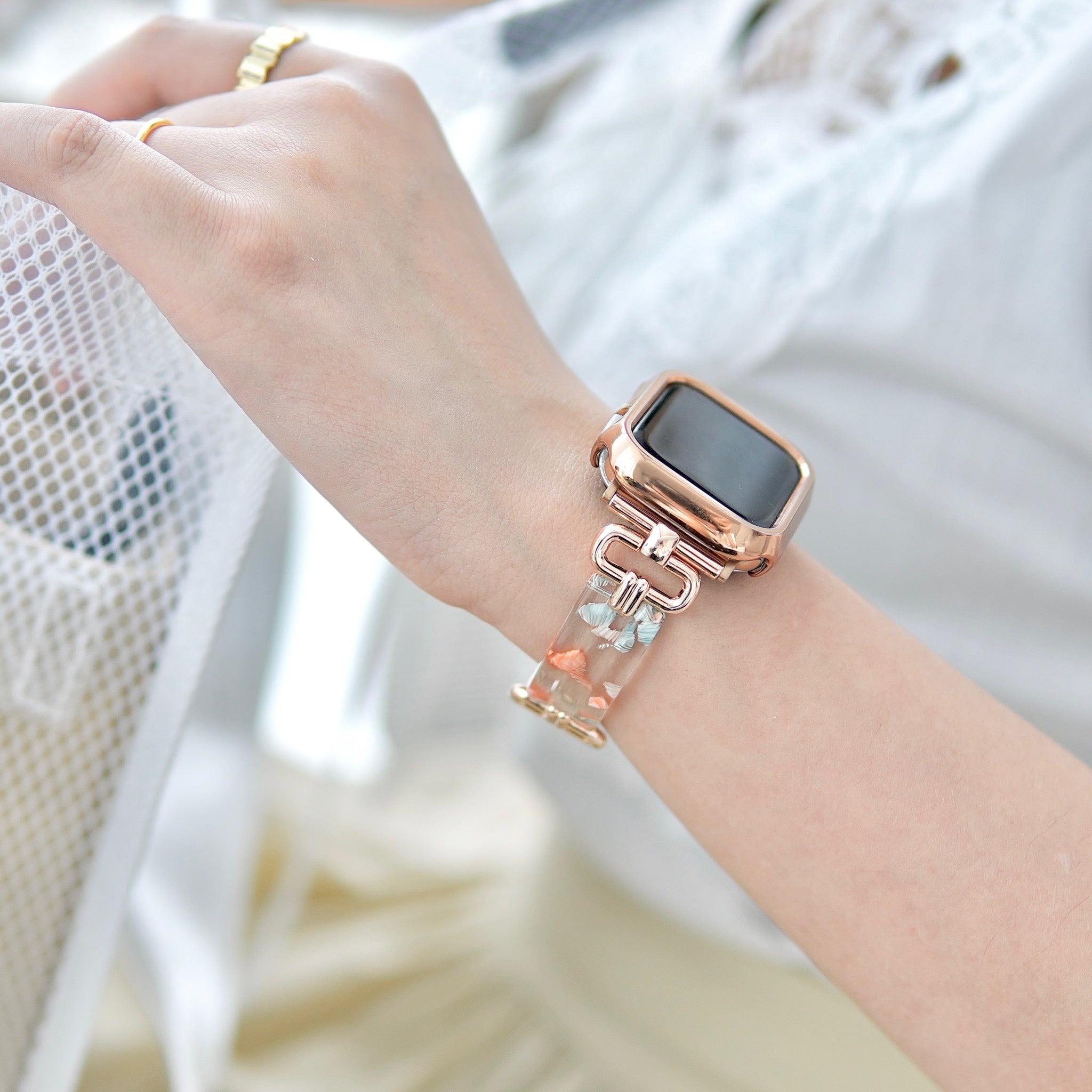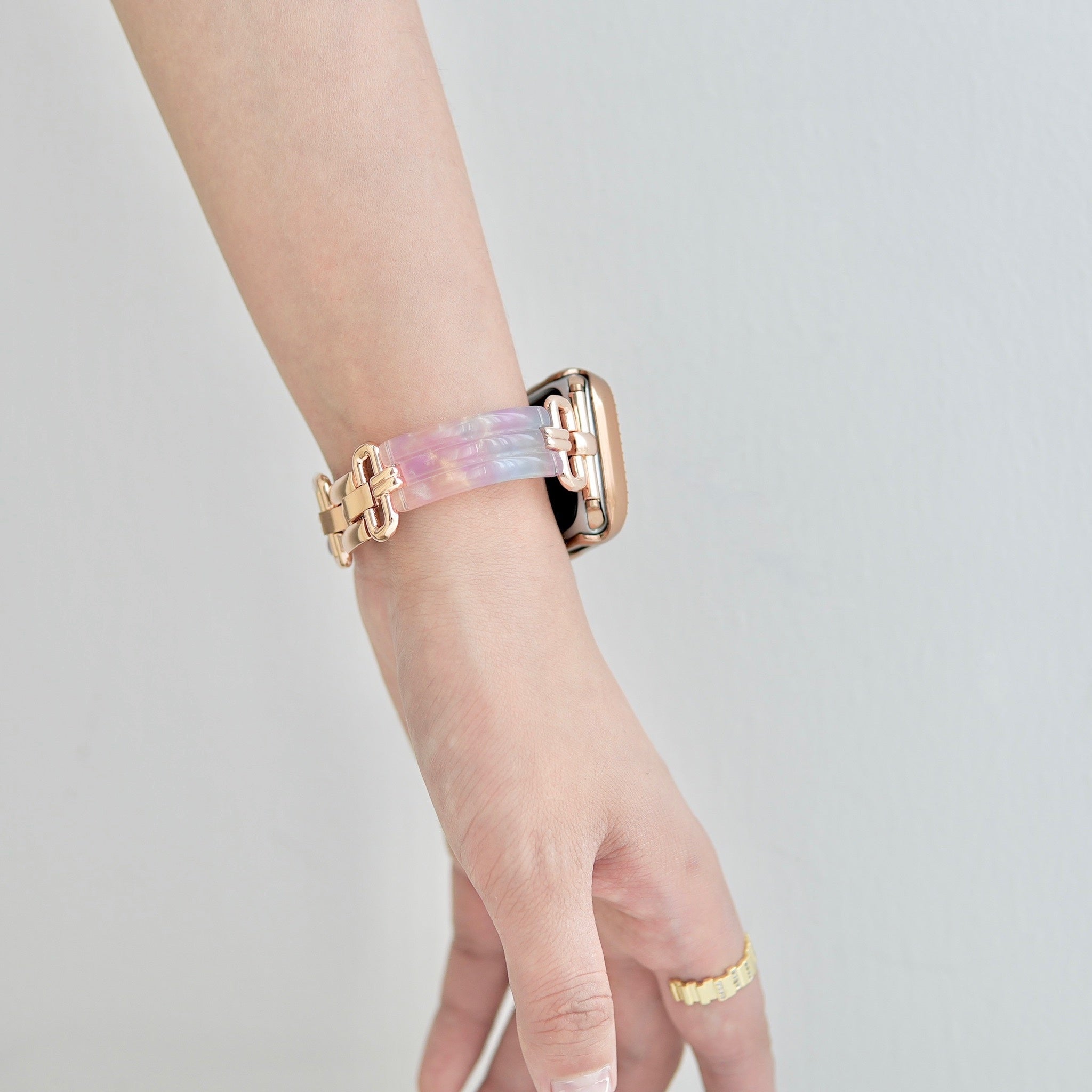 ニュアンスカラーが美しい、プラスチックとメタルの異素材ミックスバンドです。プラスチックの軽やかな透明感を、ゴールドの輝きが大人っぽく引き締めます。これからの季節にもぴったりのデザインです。