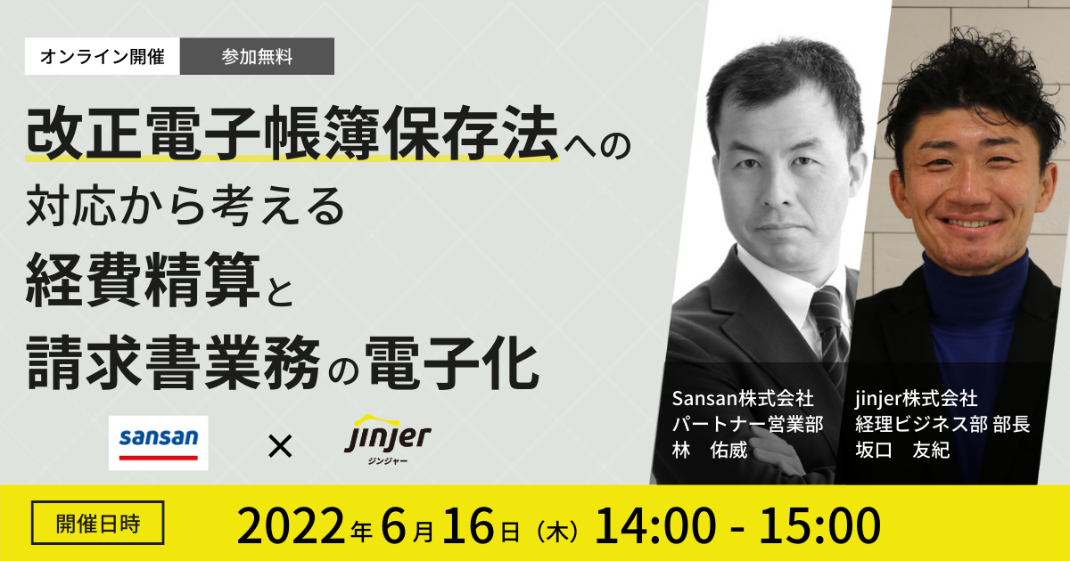 バックオフィス向けクラウドサービスを提供するjinjer株式会社(本社:東京都新宿区、代表取締役 加藤賢)は、Sansan株式会社と「改正電子帳簿保存法への対応から考える経費精算と請求書業務の電子化」に関する共催セミナーを2022年6月16日(木)に開催することをお知らせいたします。