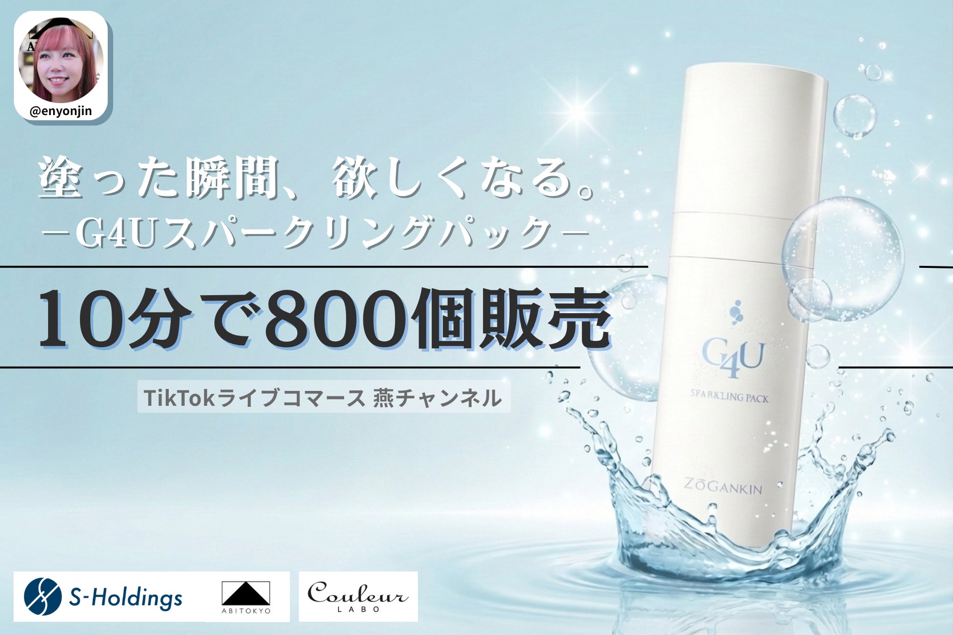 ライブコマース事業、ブランド事業、AI事業などを展開し、日常と未来を彩る最高の体験を創造する株式会社Sホールディングス(本社:東京都品川区、代表取締役CEO: 燕 咏靖)は、当社運営のアパレルブランドABITOKYOが企画・配信するTikTokライブコマース「燕チャンネル」において、クルールラボ株式会社(本社:東京都中央区、代表取締役:中垣 浩二)が展開する炭酸美容パック「【ZOGANKIN】G4Uスパークリングパック」を販売し、紹介開始から約10分で約800個を販売しました。本実績は、2026年3月13日(金)のライブ配信によるもので、使用シーンの実演やリアルタイムでの質疑応答を通じて商品の魅力を直感的に伝えることで、視聴者の理解と納得を促進し、短時間での購買集中を実現しました。