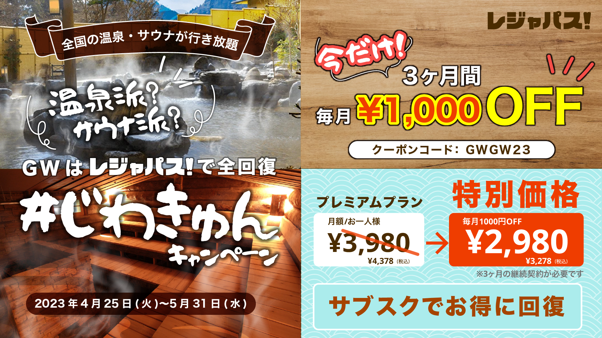 日本最大(※)のレジャー・エンタメ定額制遊び放題サービス「レジャパス」を運営する株式会社ORIGRESS PARKS(本社:東京都品川区、代表取締役社長:吉武優)は、2023年4月25日(火)〜5月31日(水)の期間中、温泉・サウナに行けば行くほどお得になる「温泉派?サウナ派?GWはレジャパスで全回復 #じわきゅん キャンペーン」を開催します。さらに新規会員さまには、プレミアムプランが3ヶ月間毎月1000円OFFになります。