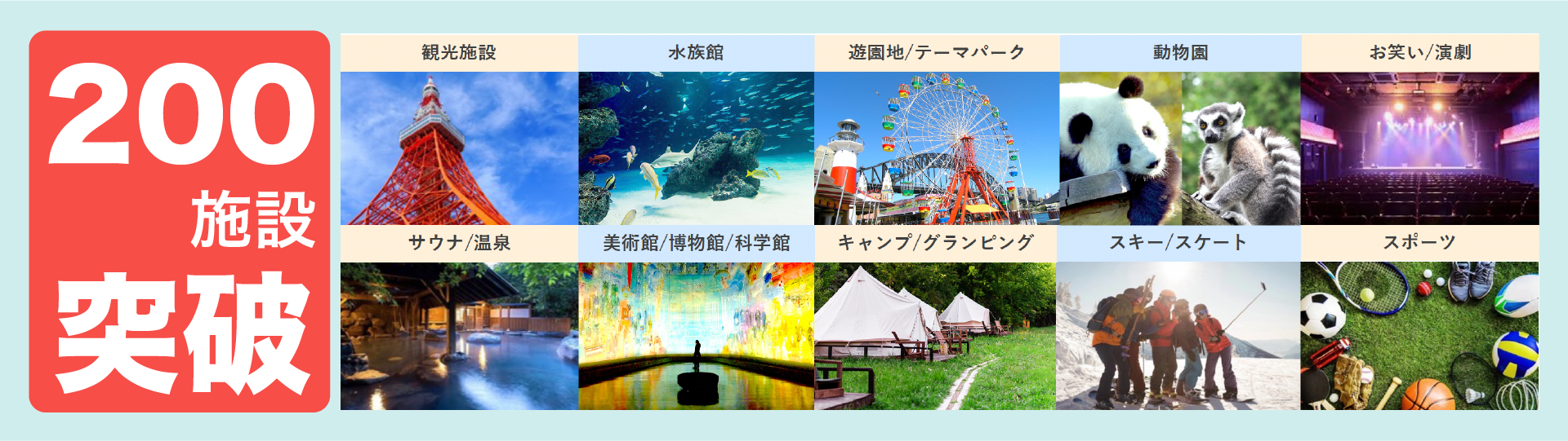 <関東>【東京】東京タワー/サンシャイン水族館/東京ジョイポリス/浅草花やしき/コニカミノルタプラネタリアTOKYO/よみうりランド/東京健康ランド まねきの湯/東京トリックアート迷宮館/スモールワールズTOKYO/Tリーグ(大田区総合体育館)/アルバルク東京 他 【神奈川】横浜ランドマークタワー 69階展望フロア 「スカイガーデン」/箱根小涌園ユネッサン/英国アンティーク博物館BAM鎌倉/横浜トリックアートクルーズ/三溪園/横浜イングリッシュガーデン 他 【千葉】よしもと幕張イオンモール/カンドゥー/大江戸温泉物語 浦安万華郷/SPA&HOTEL 舞浜ユーラシア/REWILD MUSIC FES CAMP/ 成田山書道美術館 他 【埼玉】リトルプラネット・ららぽーと新三郷 他 【群馬】群馬サファリパーク/箕郷温泉 まねきの湯 他 【栃木】おさるランド 日光さる軍団/那須ハイランドパーク 他