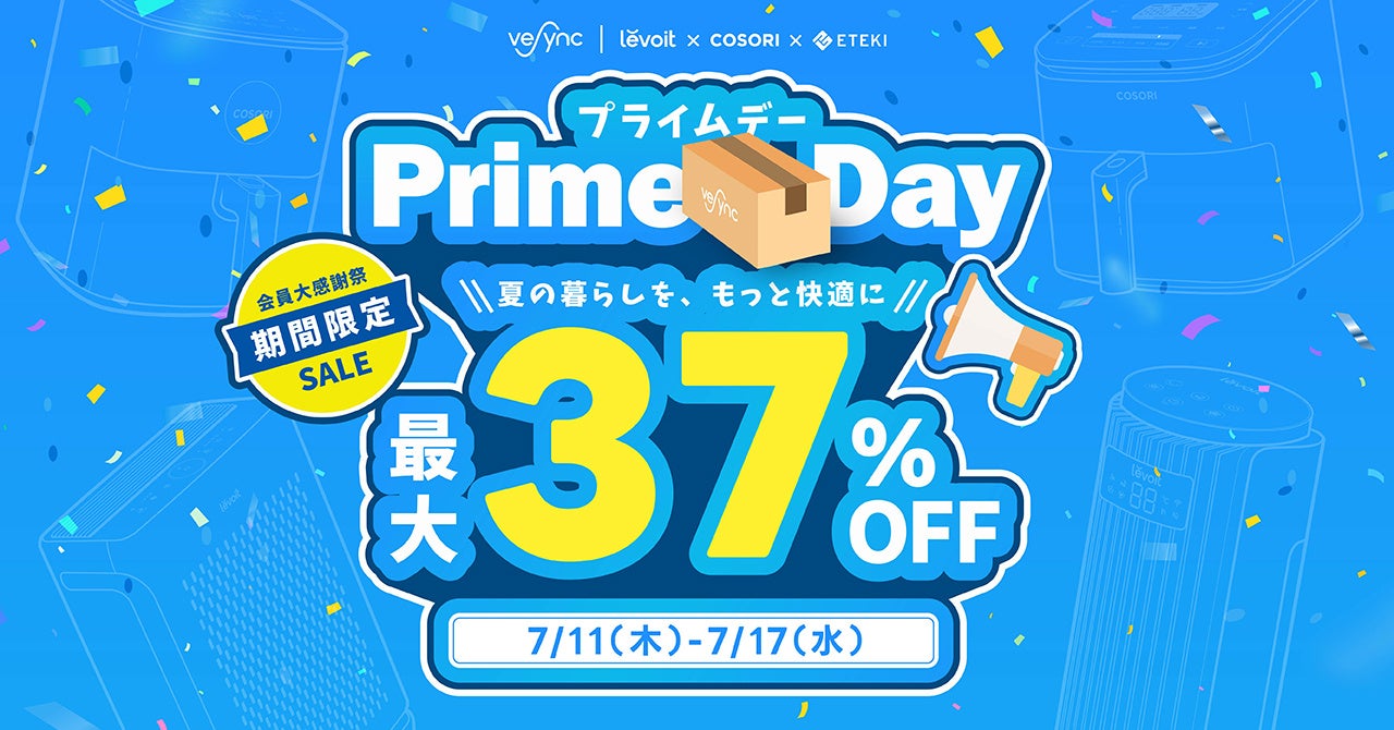 アメリカ発の小型家電メーカー、VeSync(ウィーシンク) Co., Ltd(本社:アメリカ カリフォルニア州)は、2024年7月11日(木)~2024年7月17日(水)の間、人気製品「Levoit空気清浄機」や「COSORIノンフライヤー」を含む最大37%OFFの「Prime Dayセール」をVeSync公式ストア、VeSync Amazon公式ストアで開催します。
